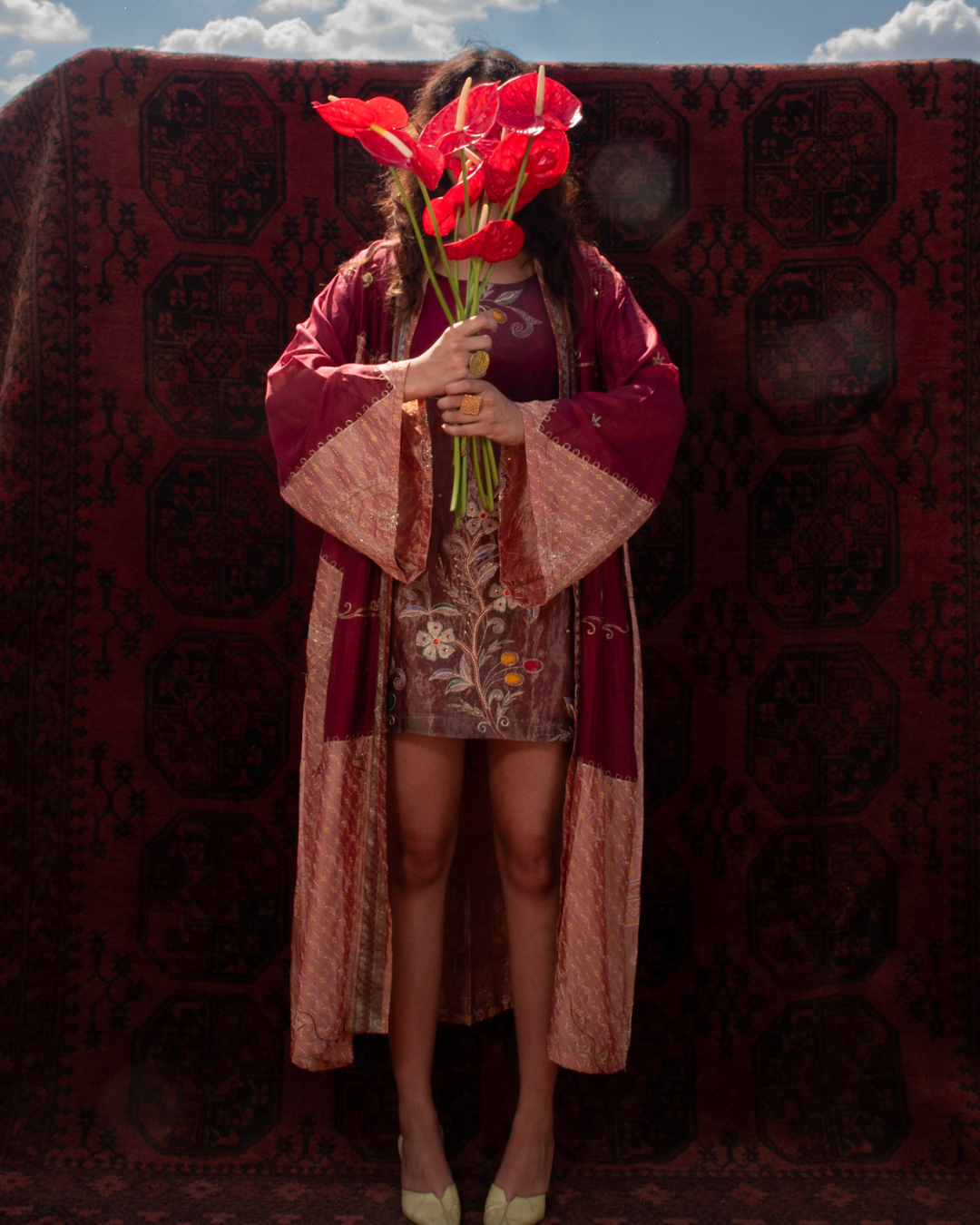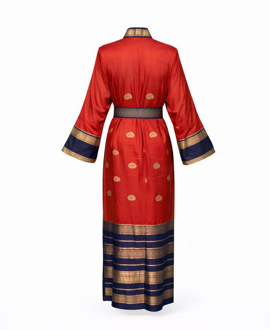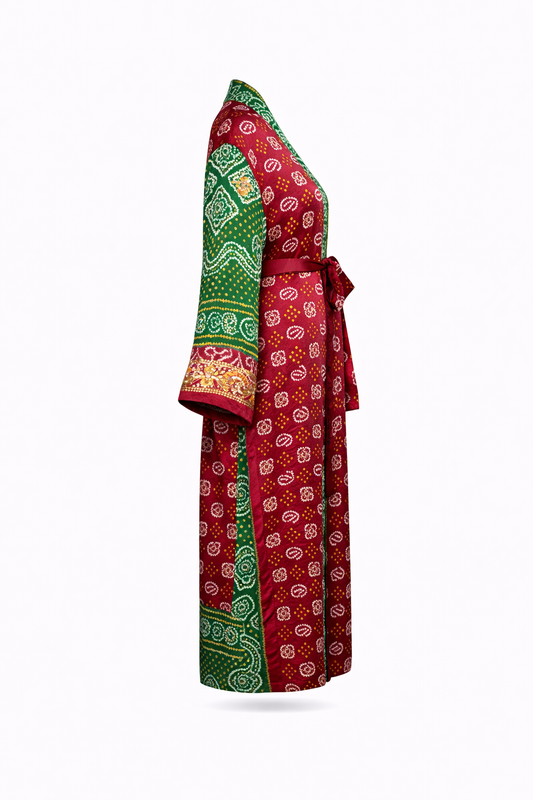 Where Indian silk meets Japanese form - vintage floral saris reimagined as Japanese kimonos in a dialogue of traditions, embodying quiet elegance and grace.
