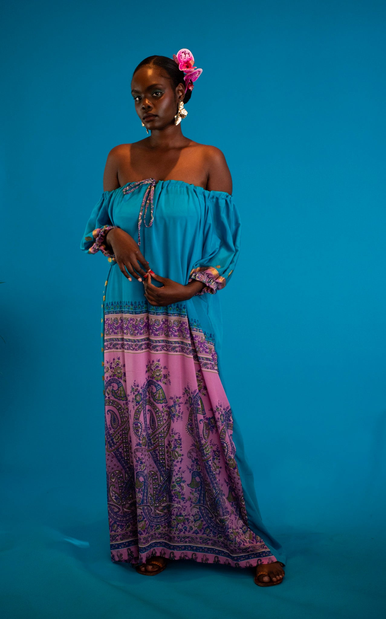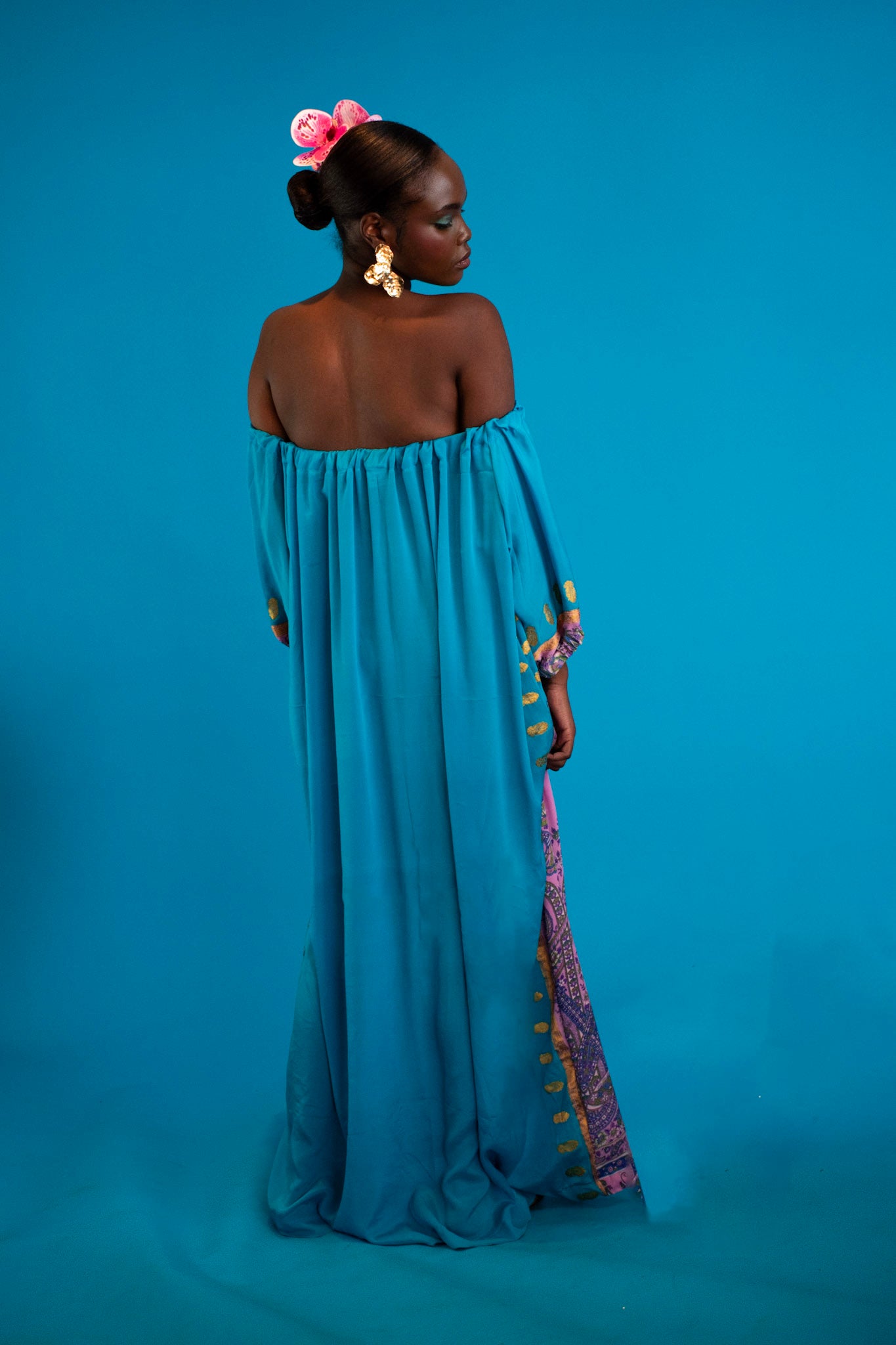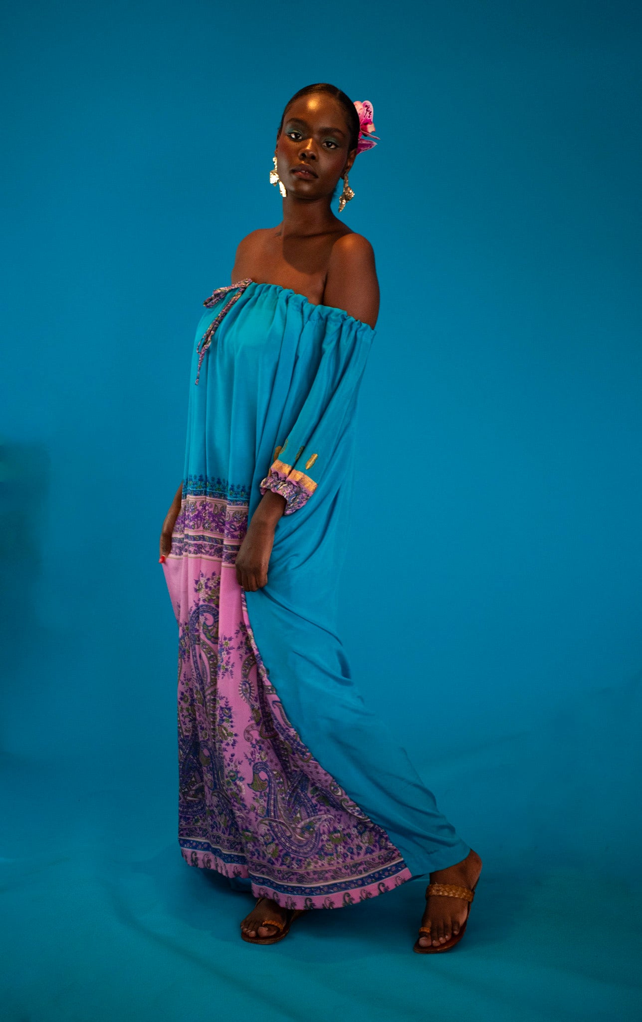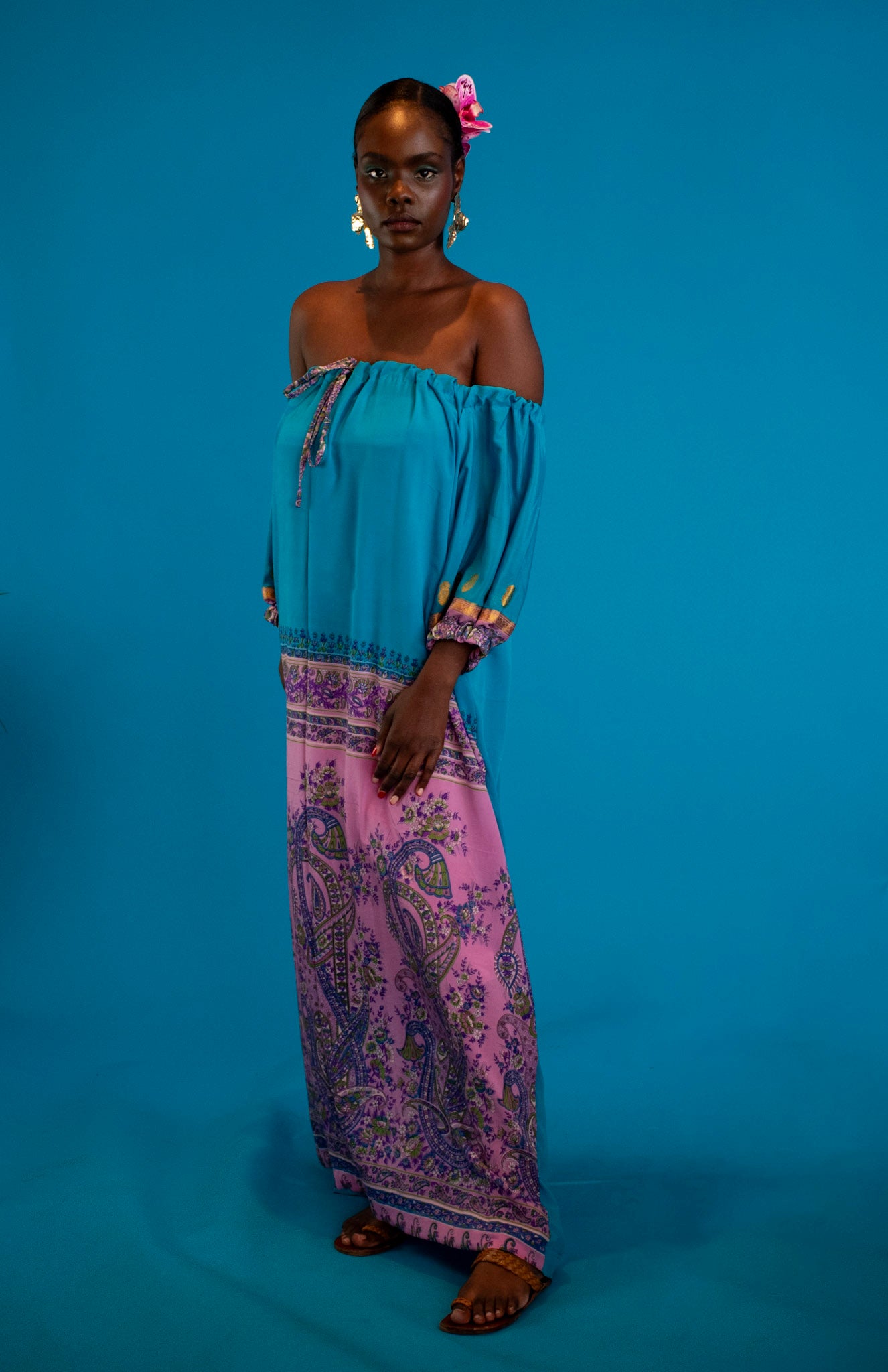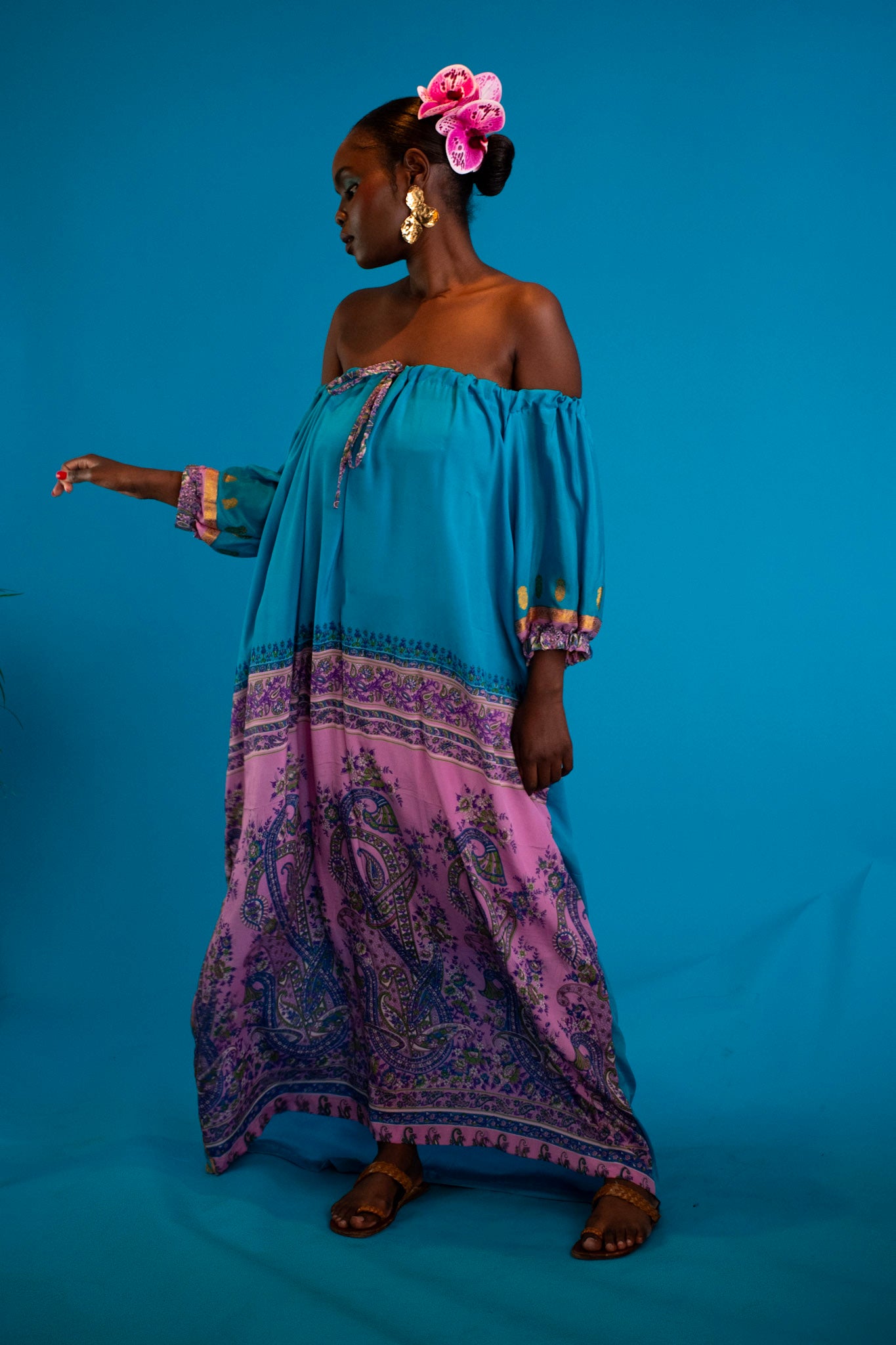 A symphony of silk and silhouette, this off-shoulder dress is crafted from repurposed vintage silk saris, where each weave carries a story of artistry and grace. The floral motifs - softly drawn, fluid, and luminous - bloom across the fabric like poetry in motion.