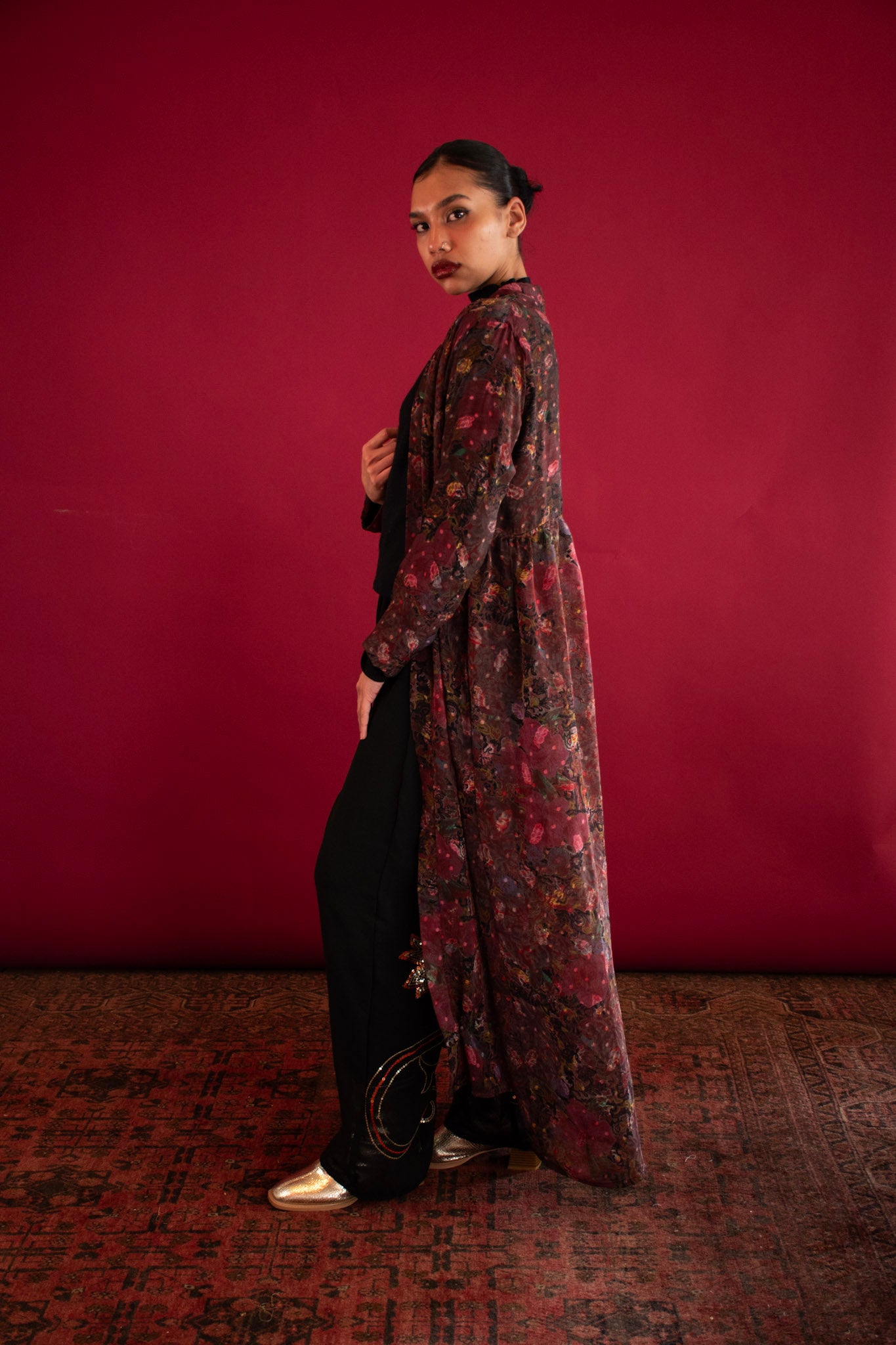 A soft frill detail at the back adds a romantic flourish, catching the breeze as you move — creating subtle drama with every step. Whether worn belted for definition or left open for a relaxed, billowing silhouette, the Sofi invites layered luxury into your wardrobe.