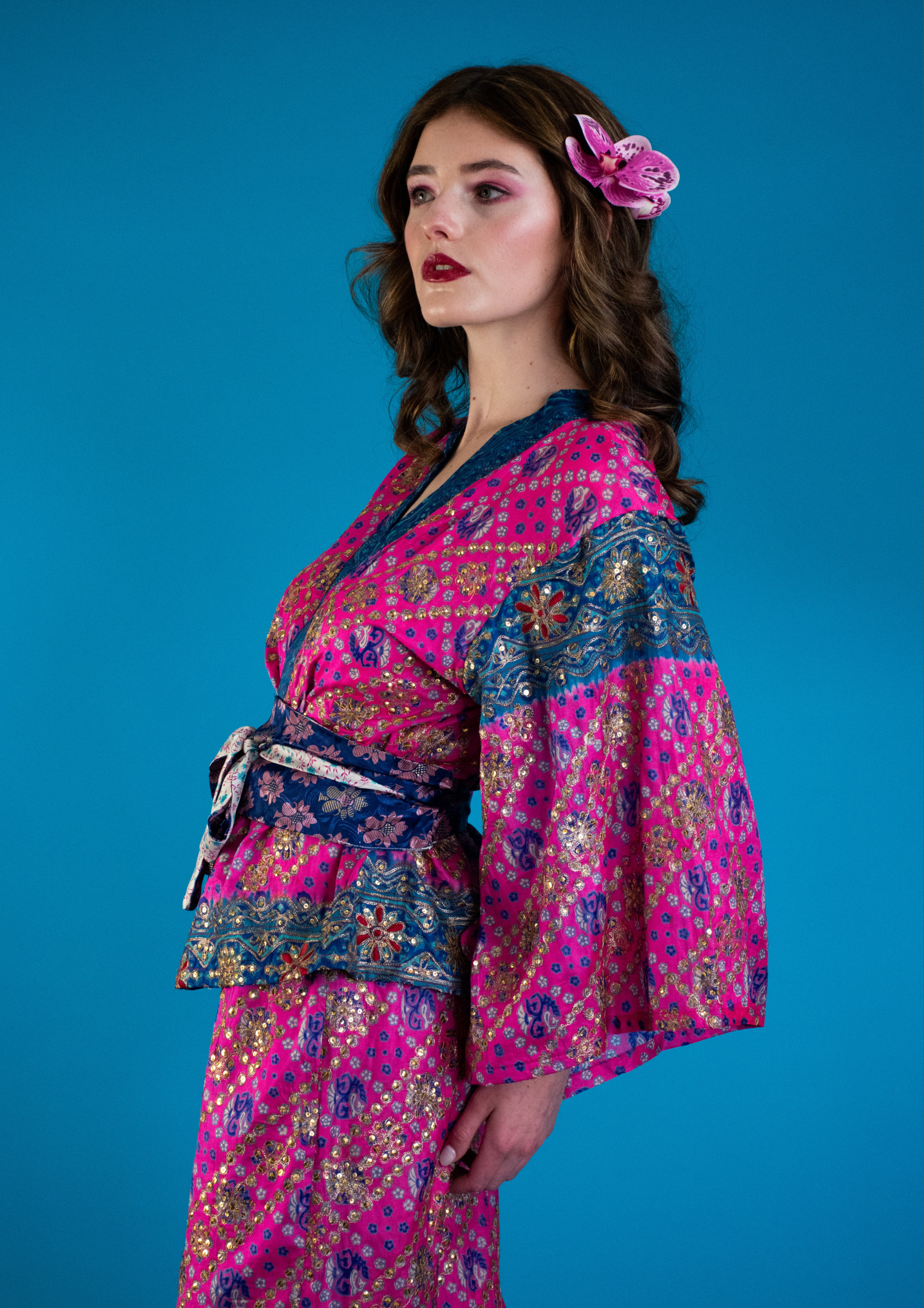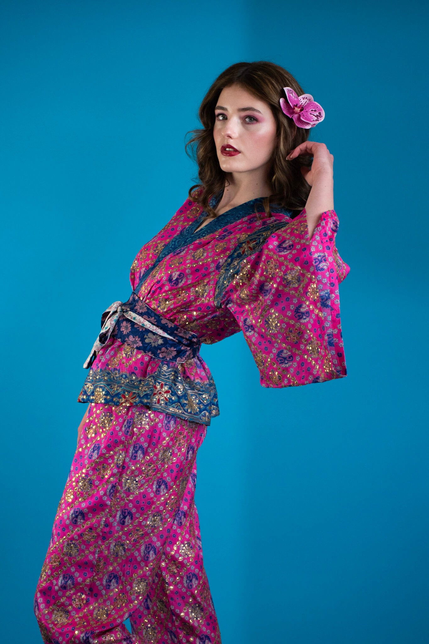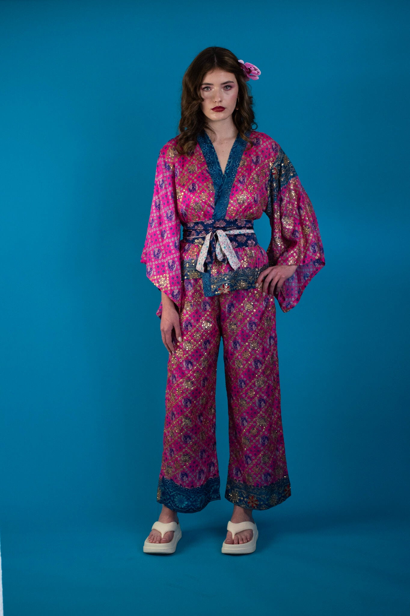 Inspired by the elegance of the Japanese kimono, this kimono jacket and pants set reimagines tradition through the artistry of Indian textiles. Each piece is crafted from carefully curated floral silk saris, selected for their fine, painterly motifs that echo the serene beauty of Japanese botanical art. The result is a refined conversation between cultures - where Indian floral expressiveness meets Japanese Art.