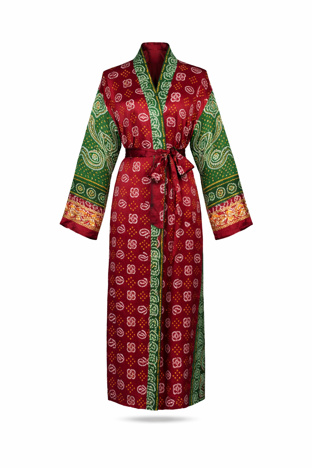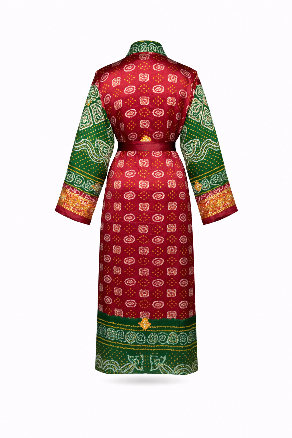 Crafted from smooth, lightweight silk, this statement kimono features a rich deep red base accented with contrasting green panels and intricate traditional motifs inspired by heritage sari textiles. Delicate beadwork is hand-applied across the fabric, adding subtle texture and a refined shimmer that catches the light without overpowering the print.