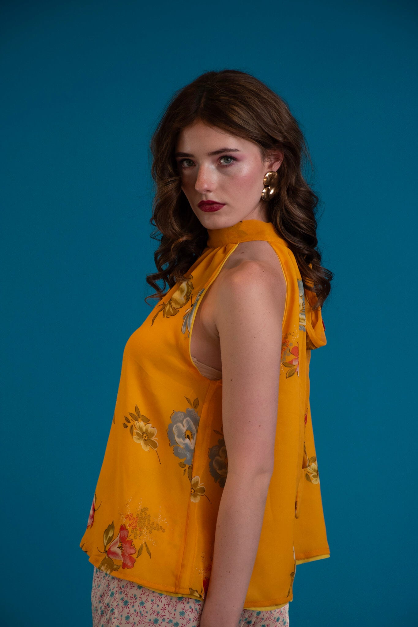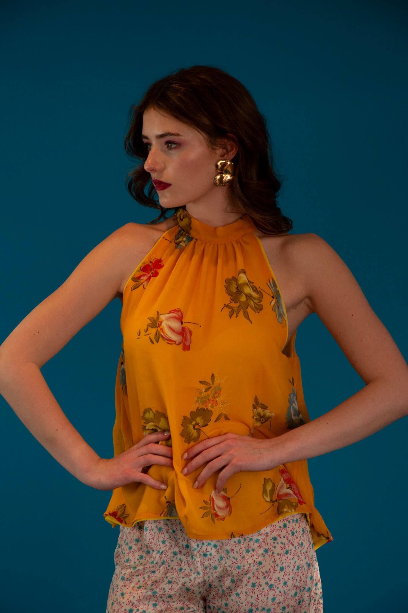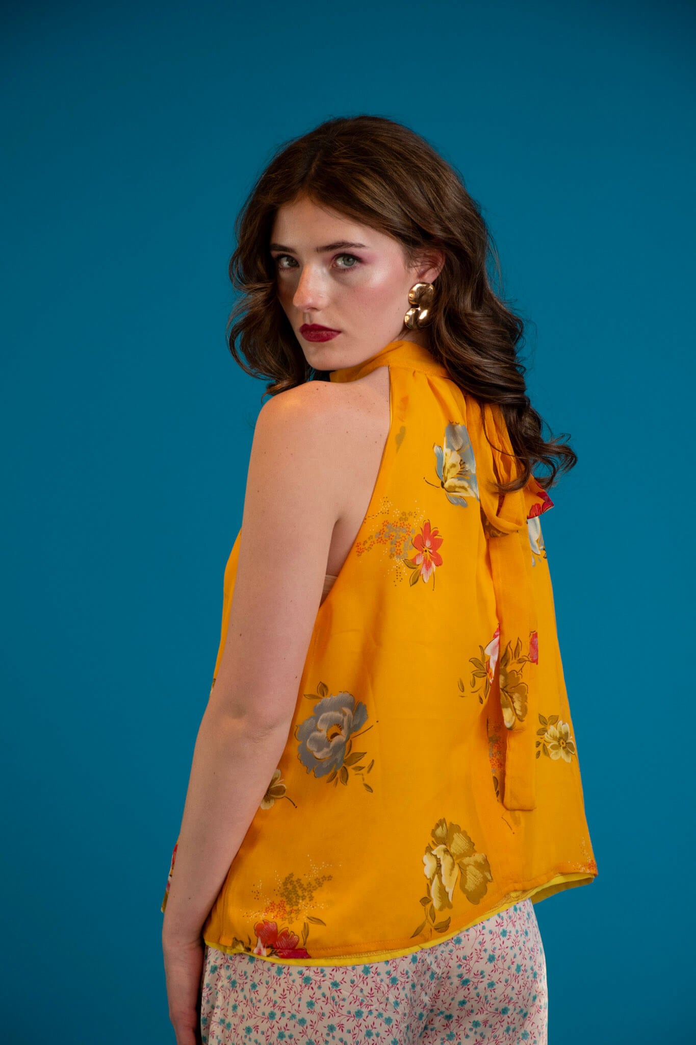 The silhouette ties gently at the neck, skimming the body with a sleek yet fluid drape. Vibrant, painterly prints bloom across the fabric, evoking sun-washed afternoons, poolside lounging, and golden-hour cocktails.