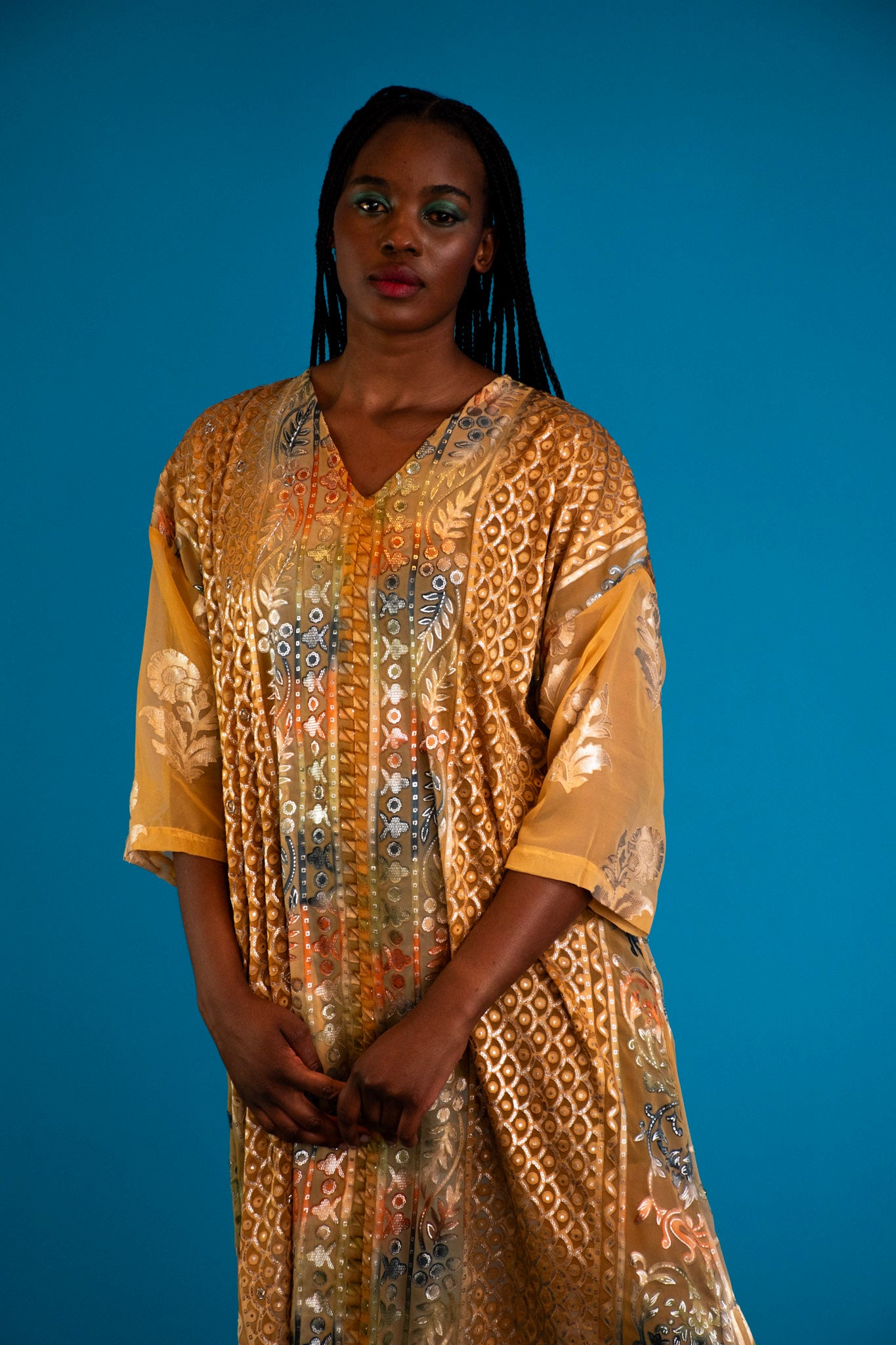 Crafted from light, breathable georgette chiffon, this piece features intricate printed patterns and hand-finished sequin accents.