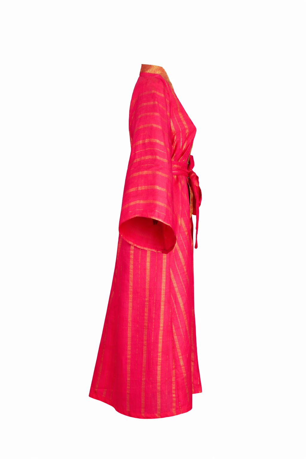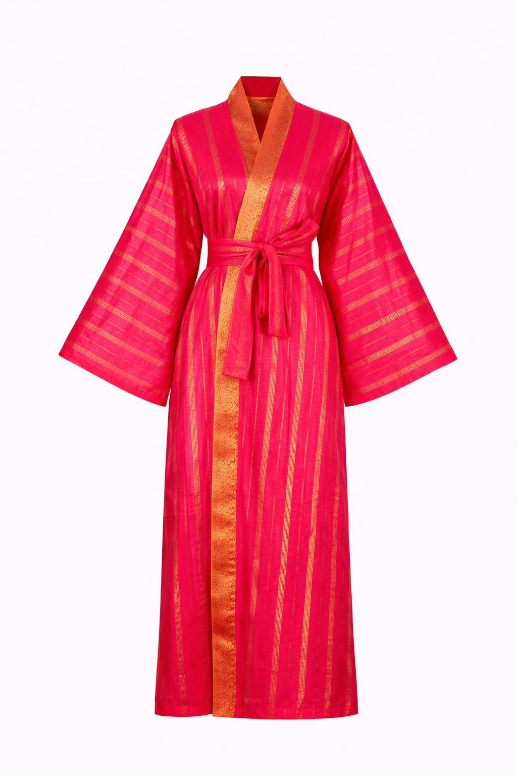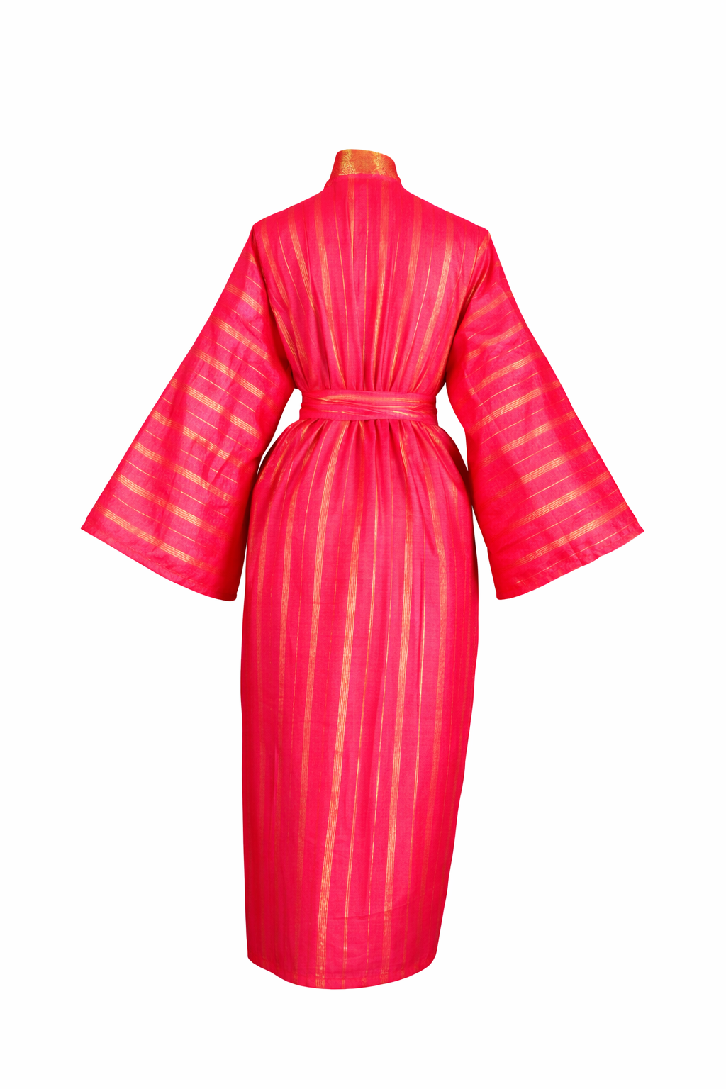 Crafted from lightweight, fluid fabric, this kimono features a vibrant fuchsia base woven with subtle gold vertical striping that catches the light beautifully. The fabric has a soft sheen and an airy drape, creating graceful movement with every step while maintaining a refined, elegant finish. A contrasting golden inner panel and collar detail add depth and a luxurious touch to the overall design.