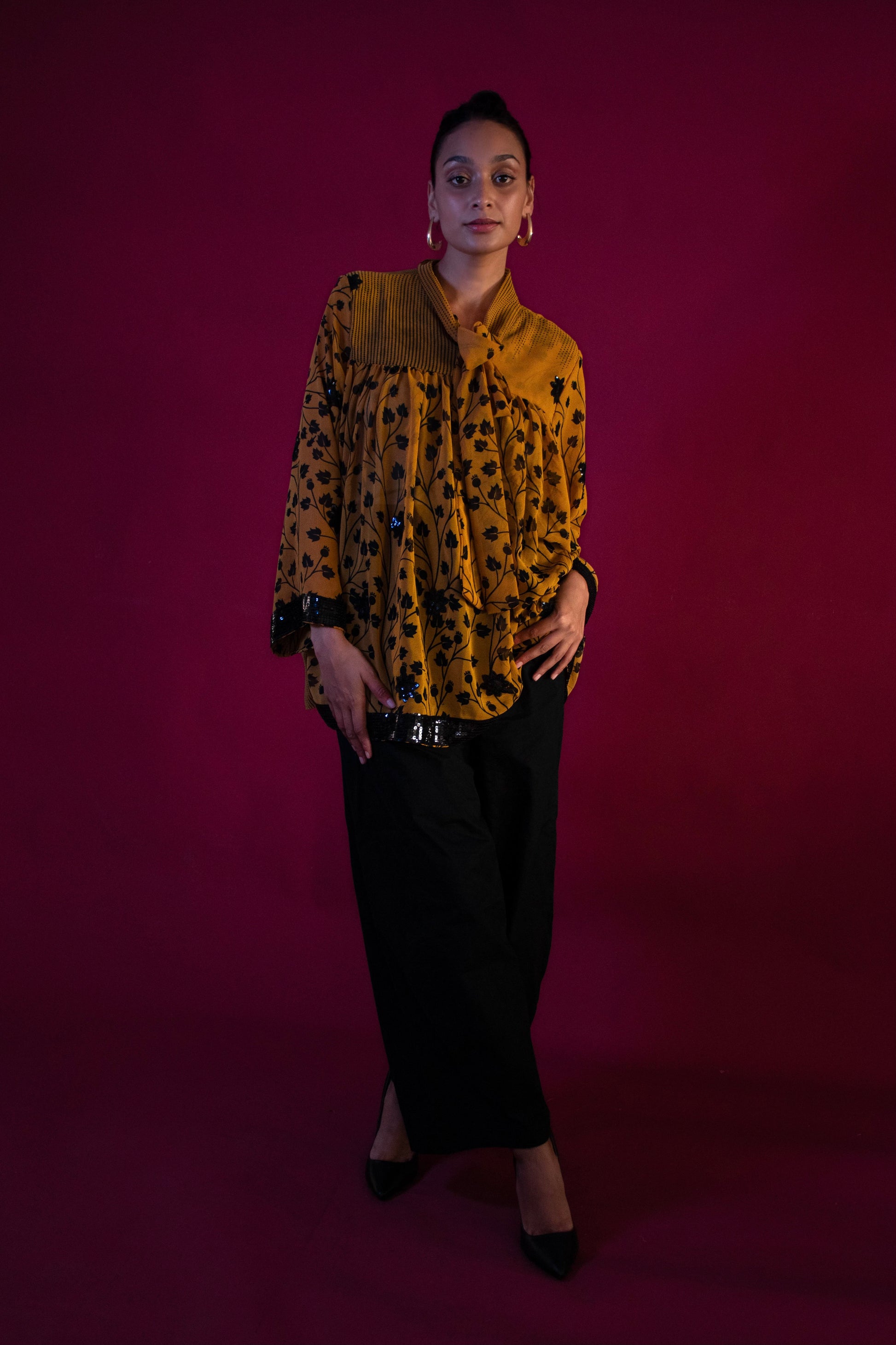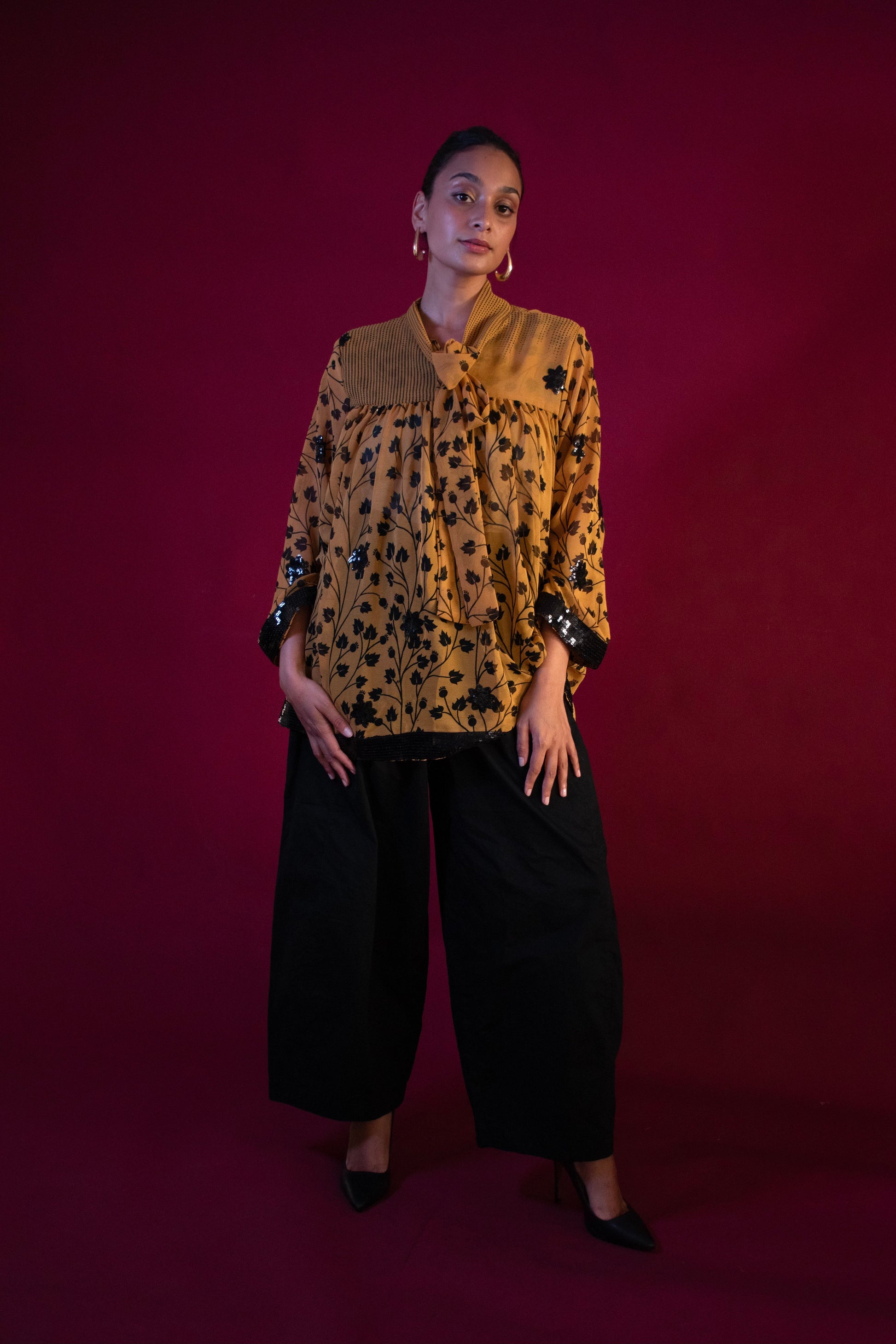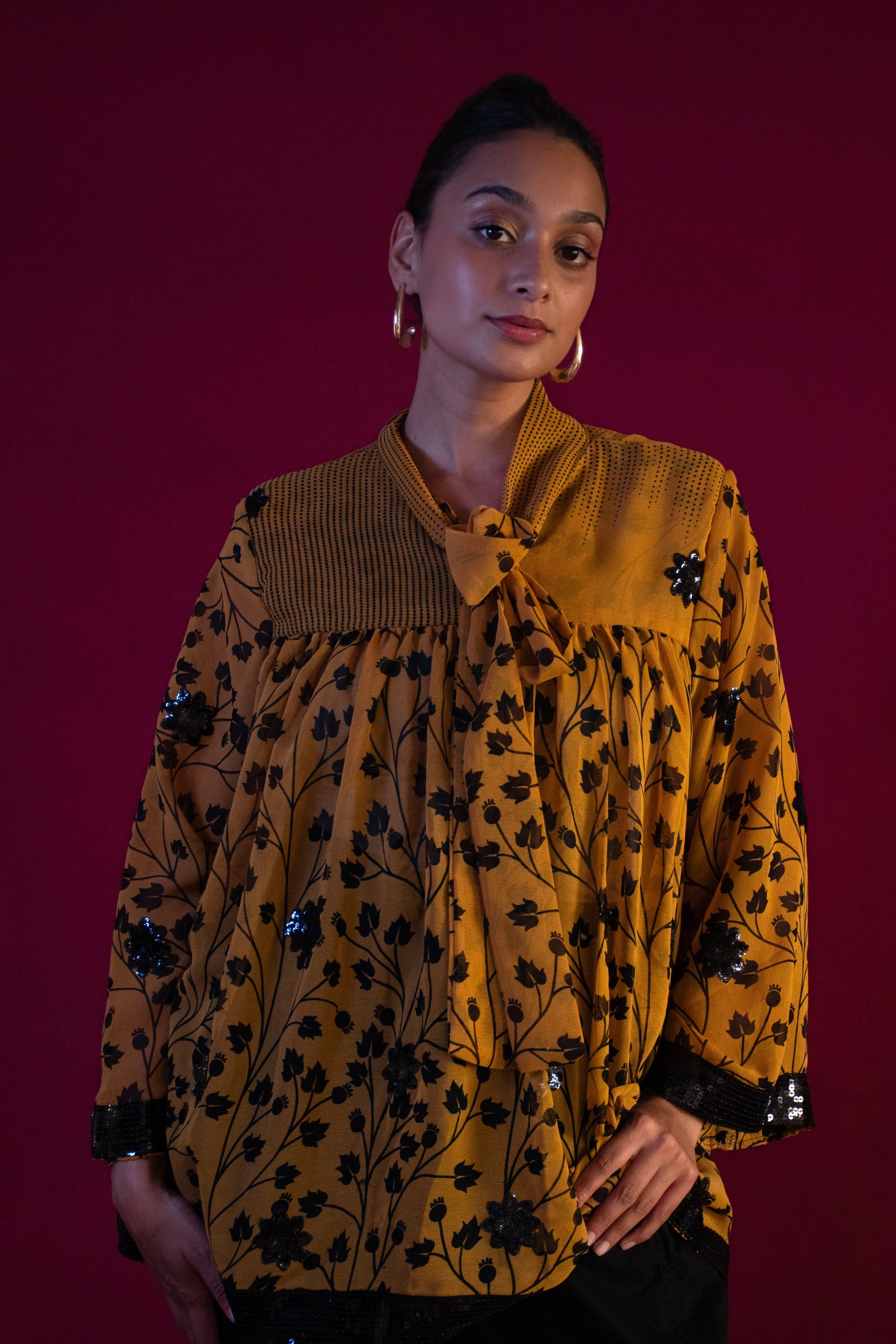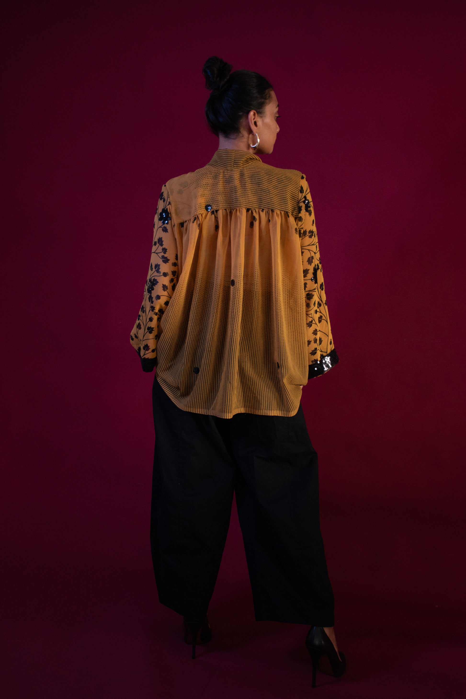 Ethereal, effortless, and infused with meaning—our Sufi Tops are crafted from chiffon saris donated by our Sari Donor community, each carrying a story of renewal. Designed to move with you, the bow-tied neckline adds a touch of elegance, while the billowing silhouette flows like poetry with every step.
