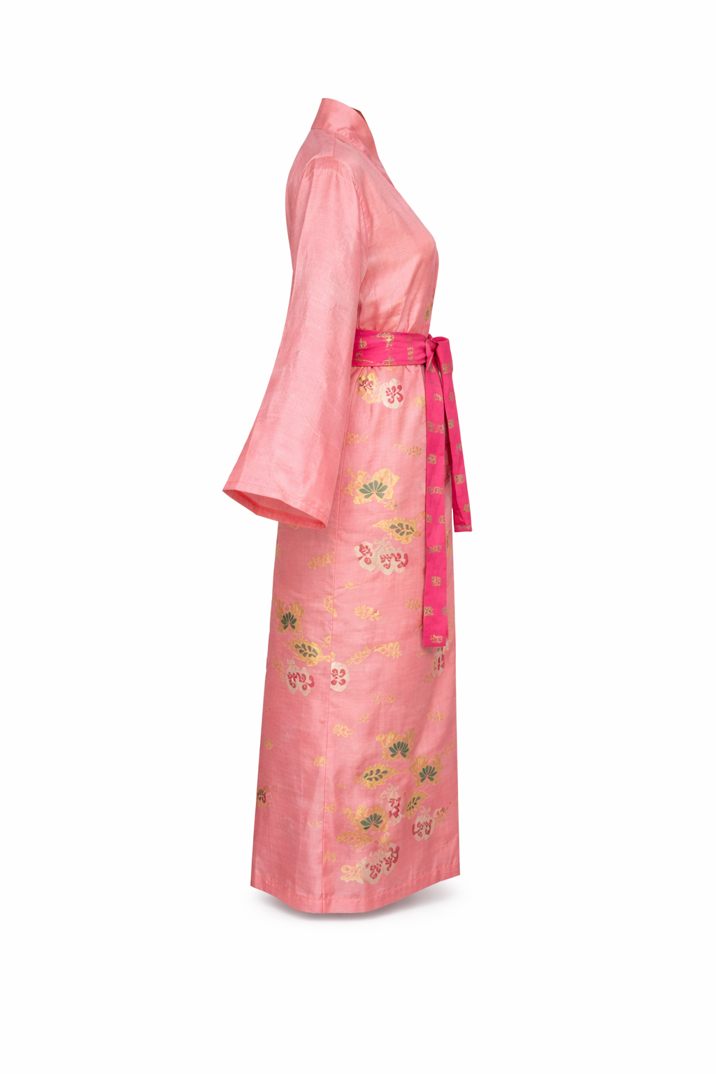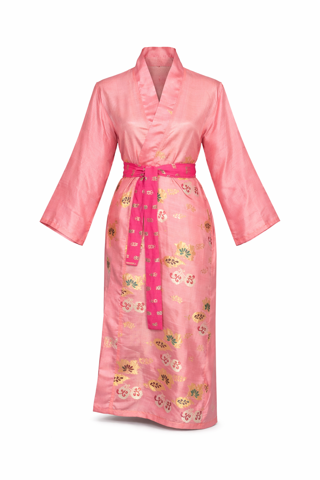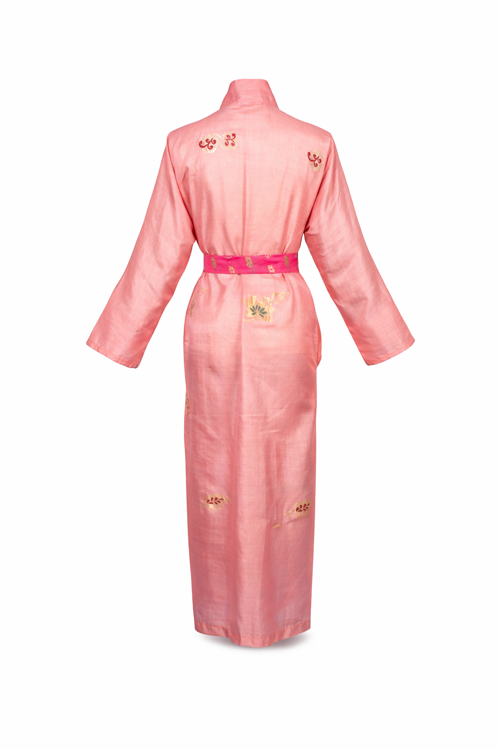 The silk is lightweight, breathable, and gently luminous, draping effortlessly over the body. A delicate wash of blush pink is accented with fine gold embroidered motifs, creating a subtle, heritage-inspired surface that feels refined and timeless.