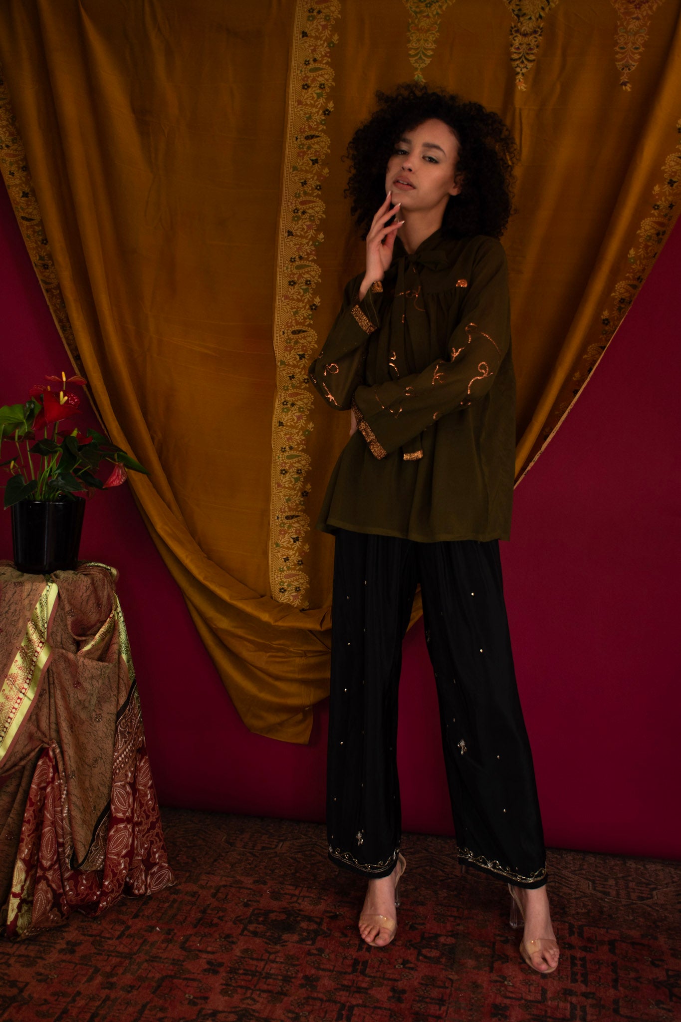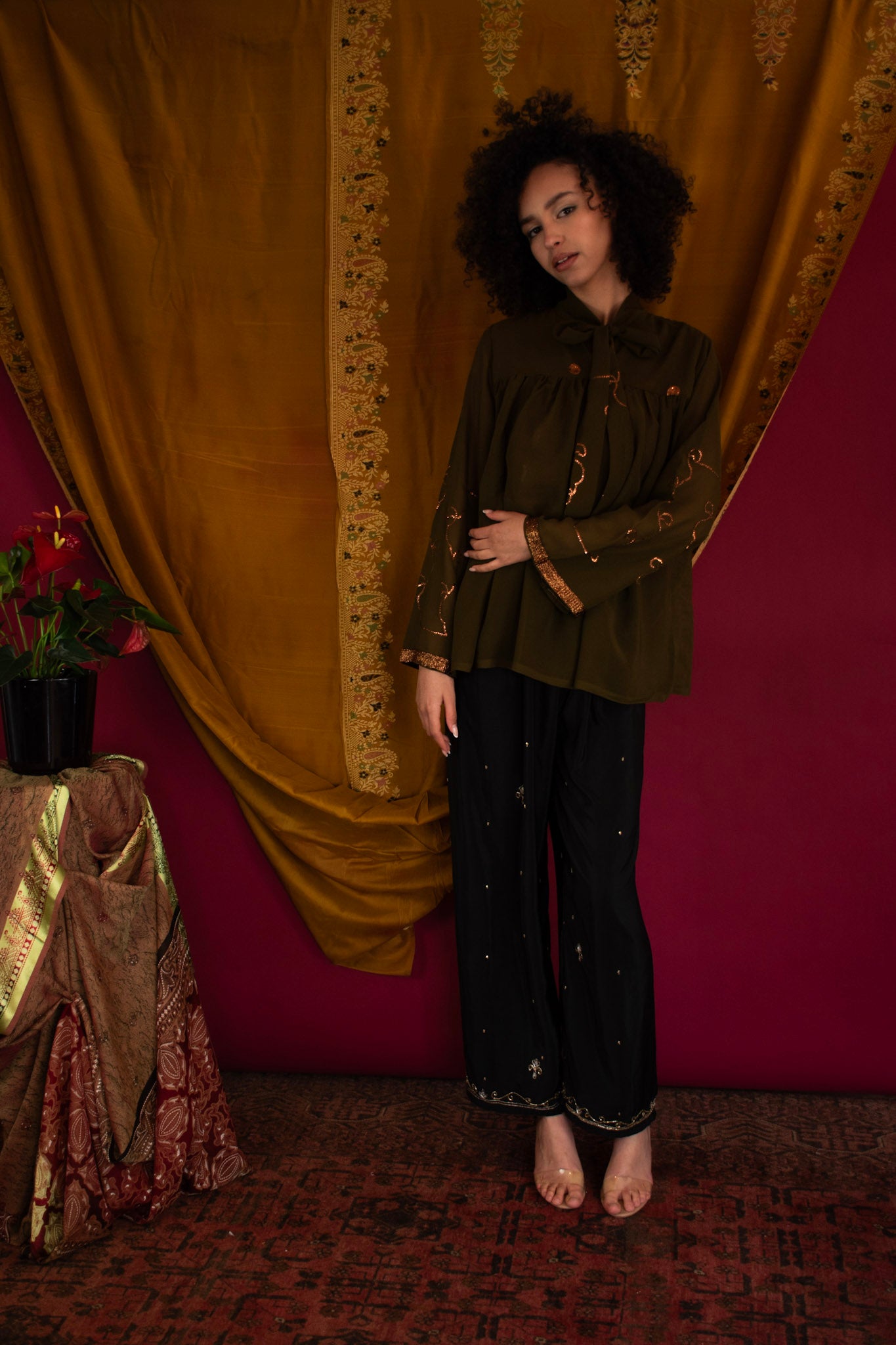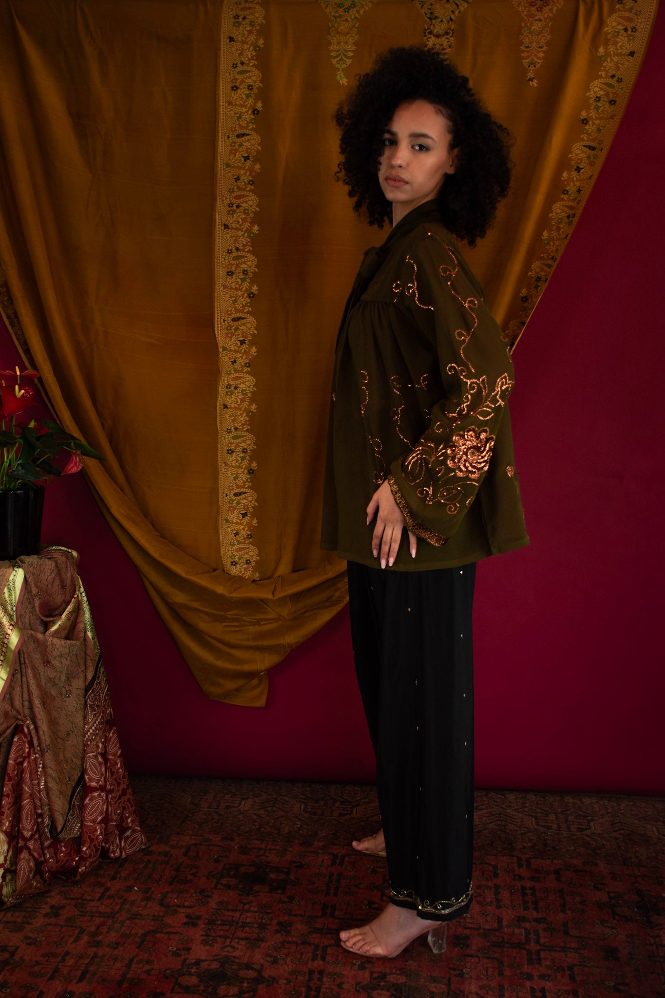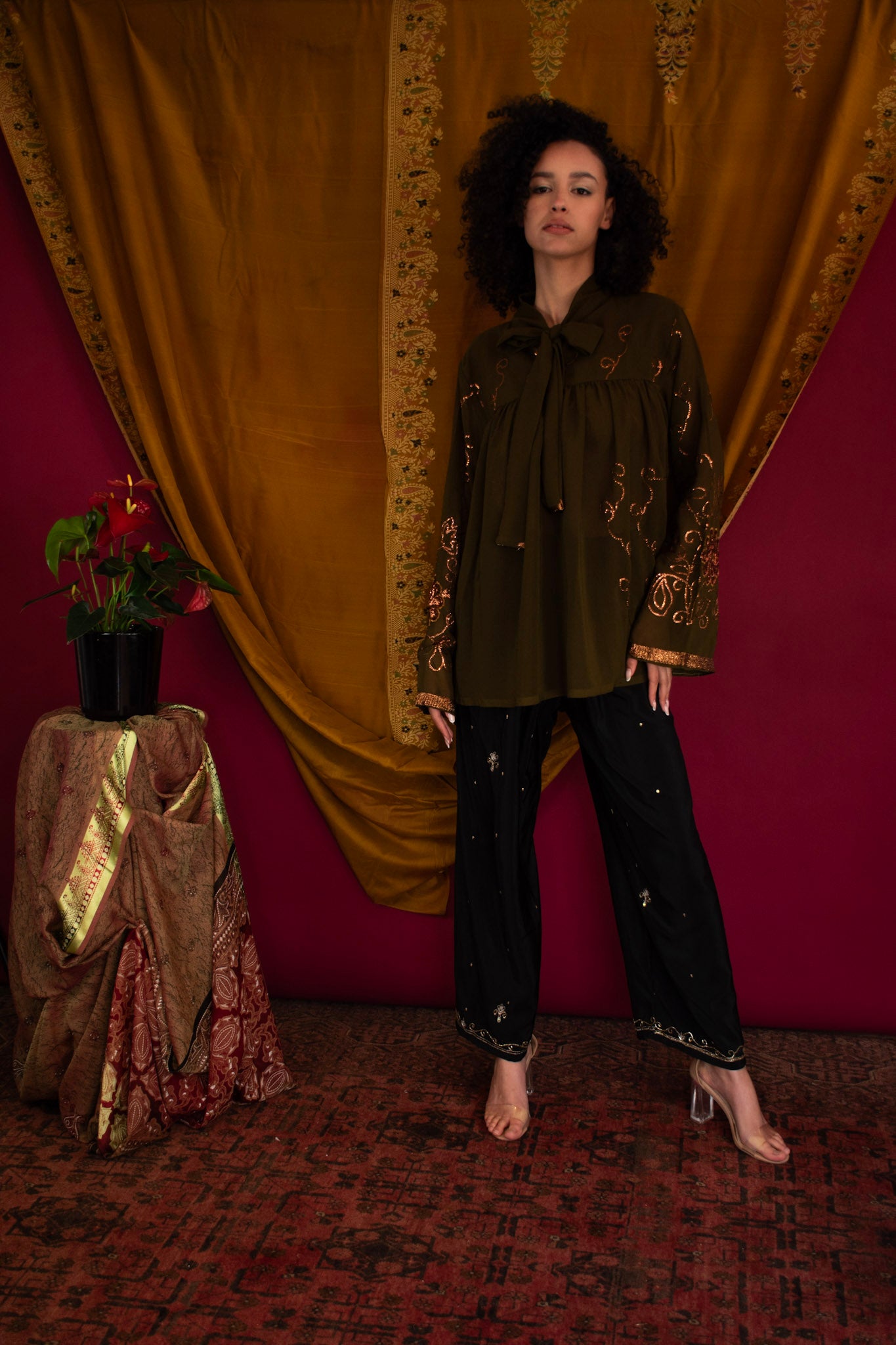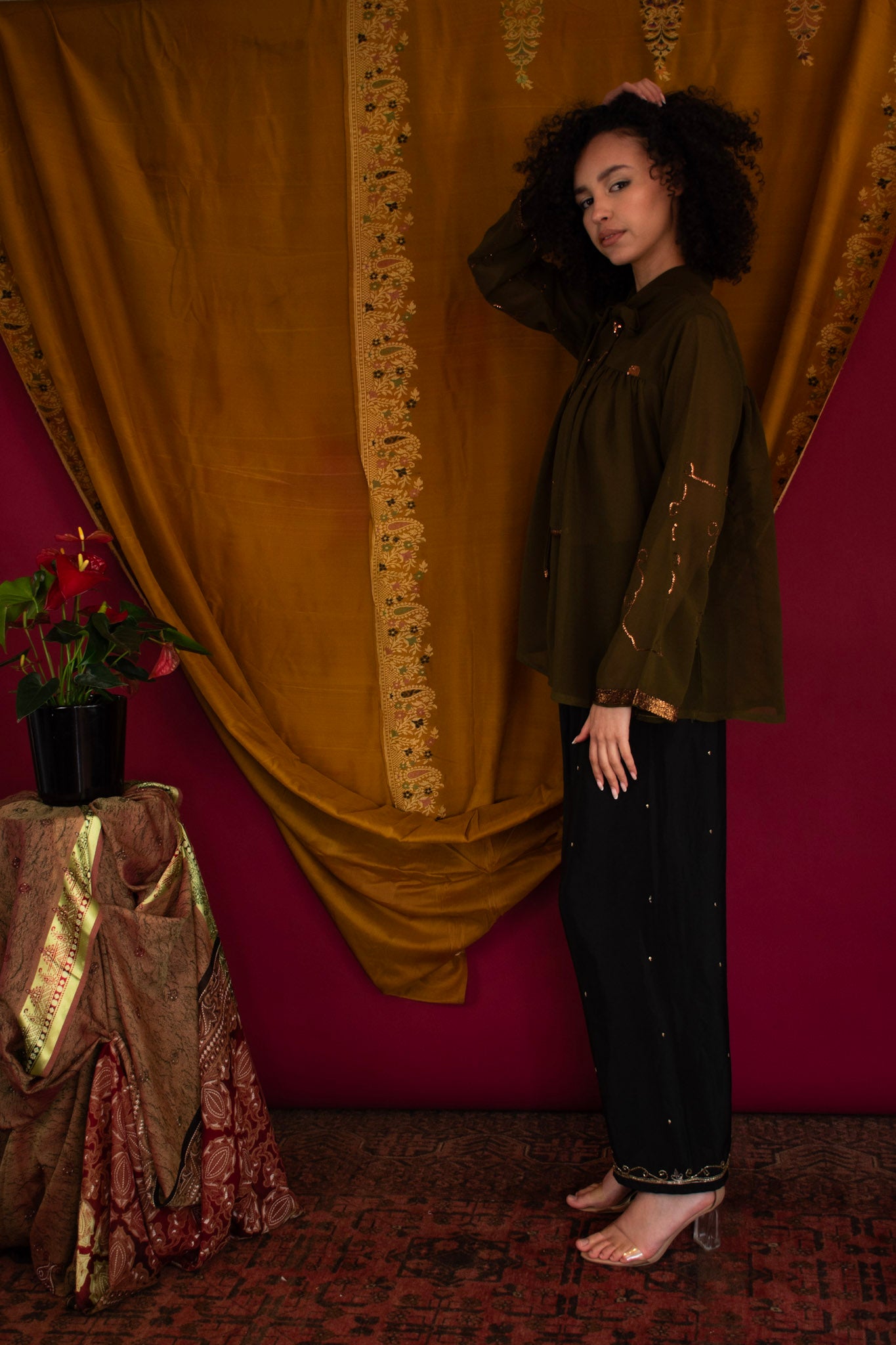 Our Sufi Tops are crafted from chiffon saris donated by our Sari Donor community, each carrying a story of renewal. Designed to move with you, the bow-tied neckline adds a touch of elegance, while the billowing silhouette flows like poetry with every step.