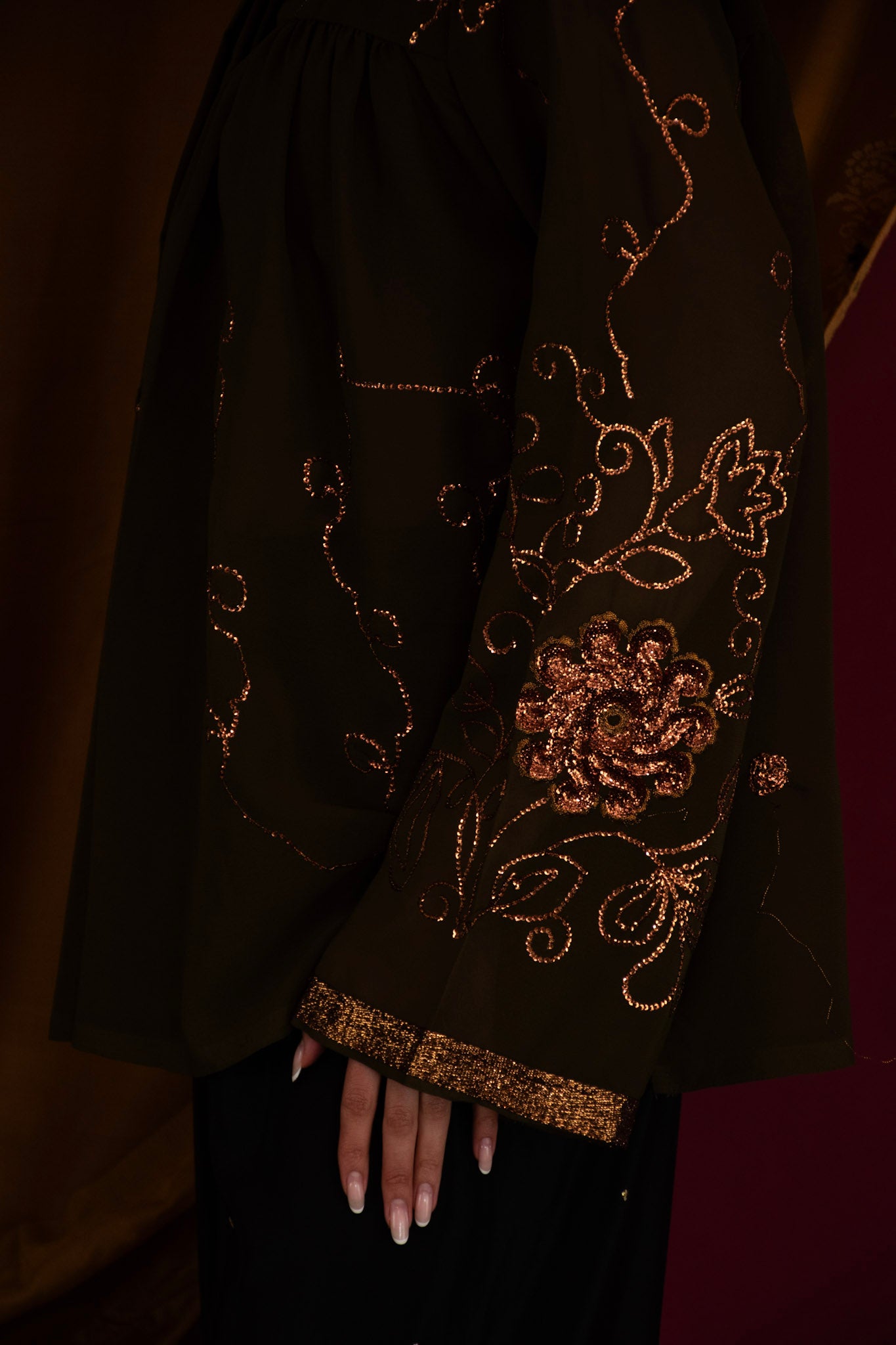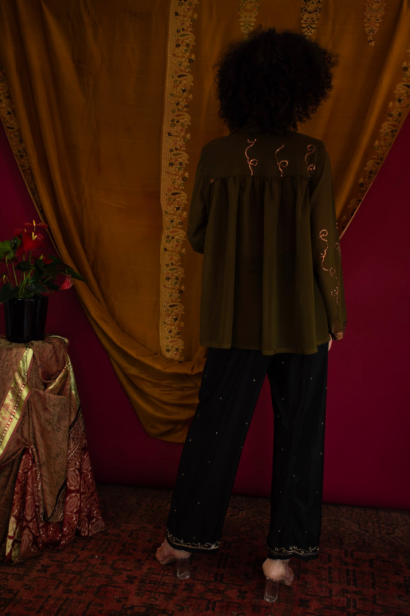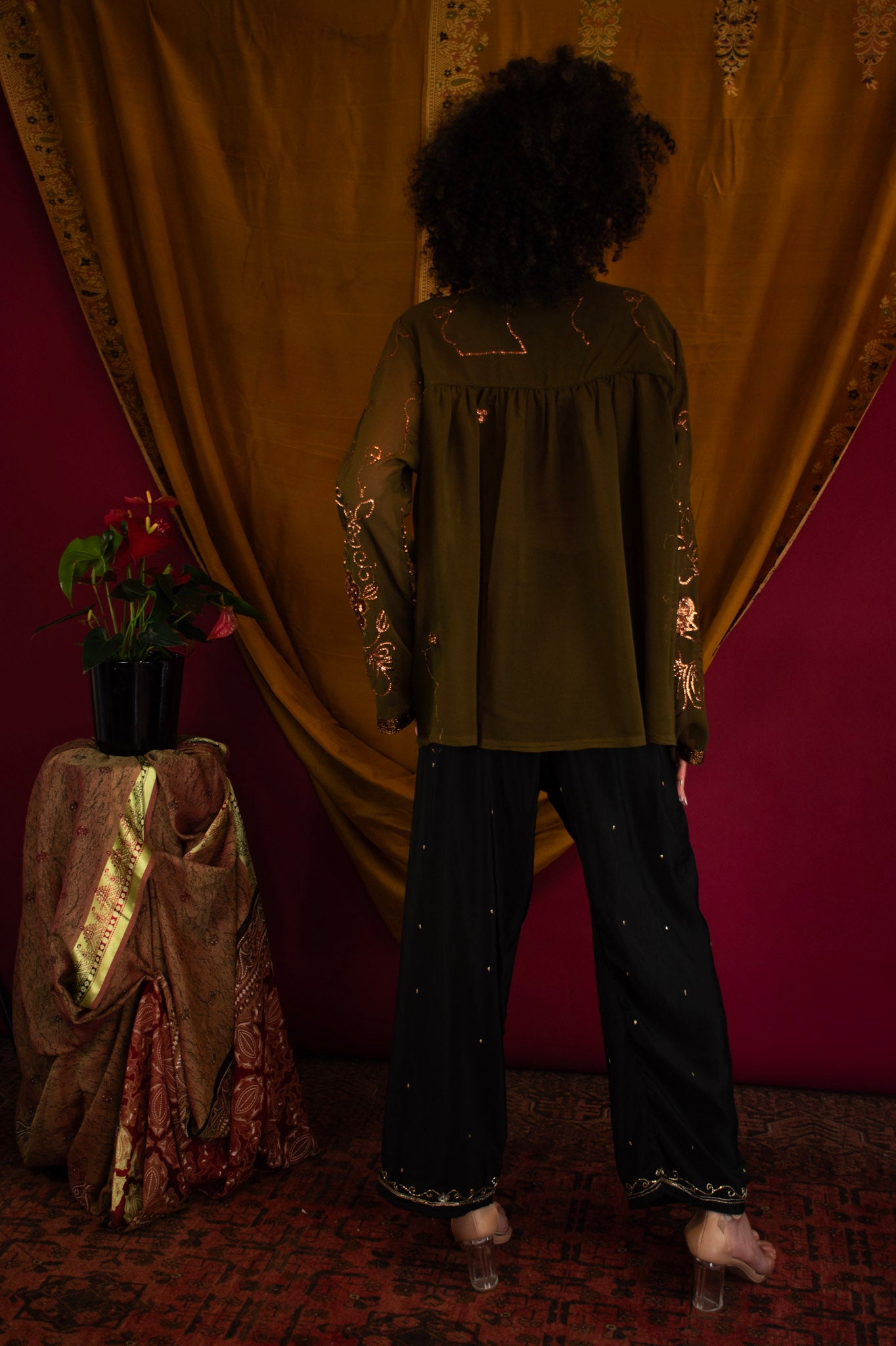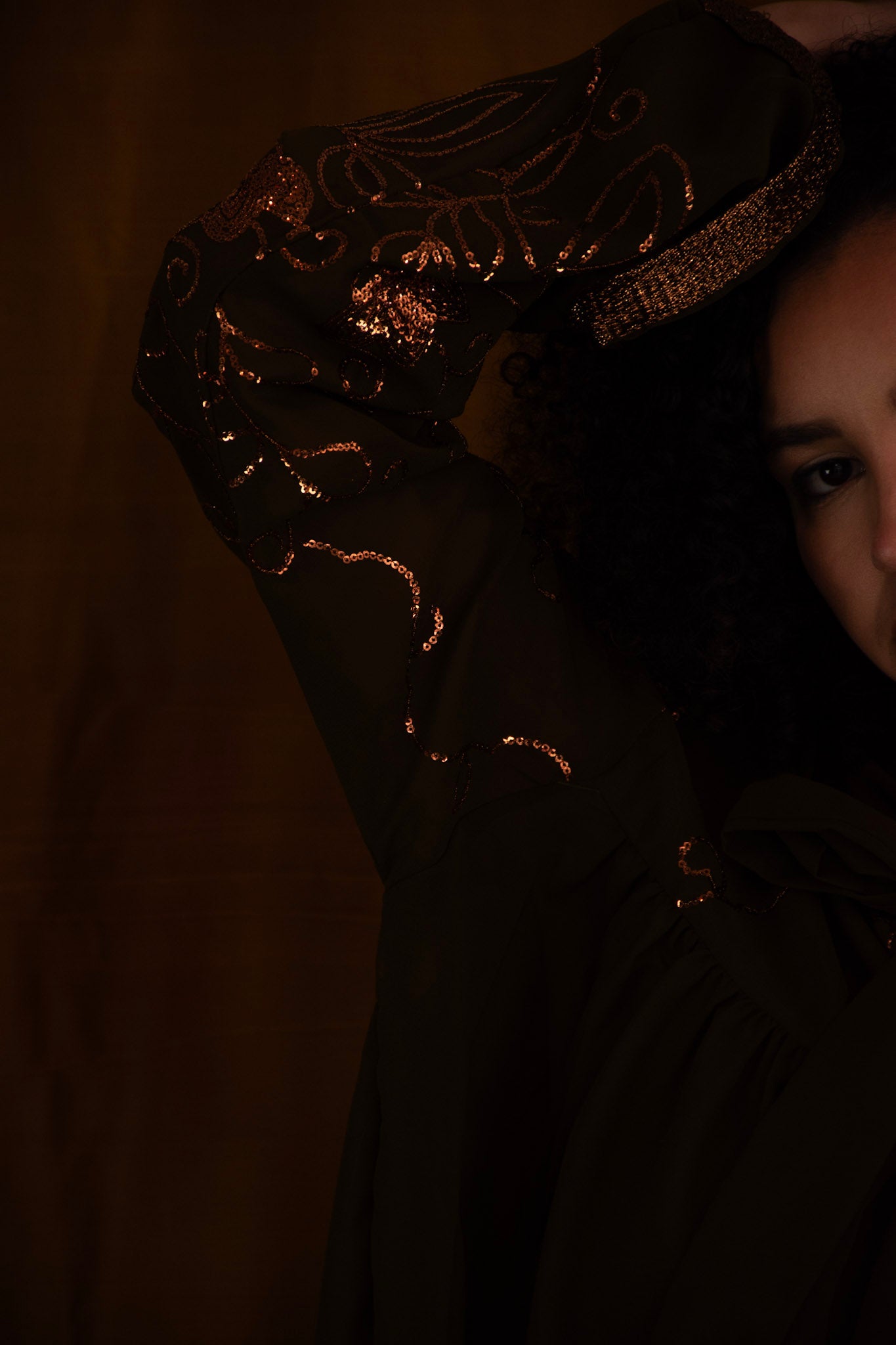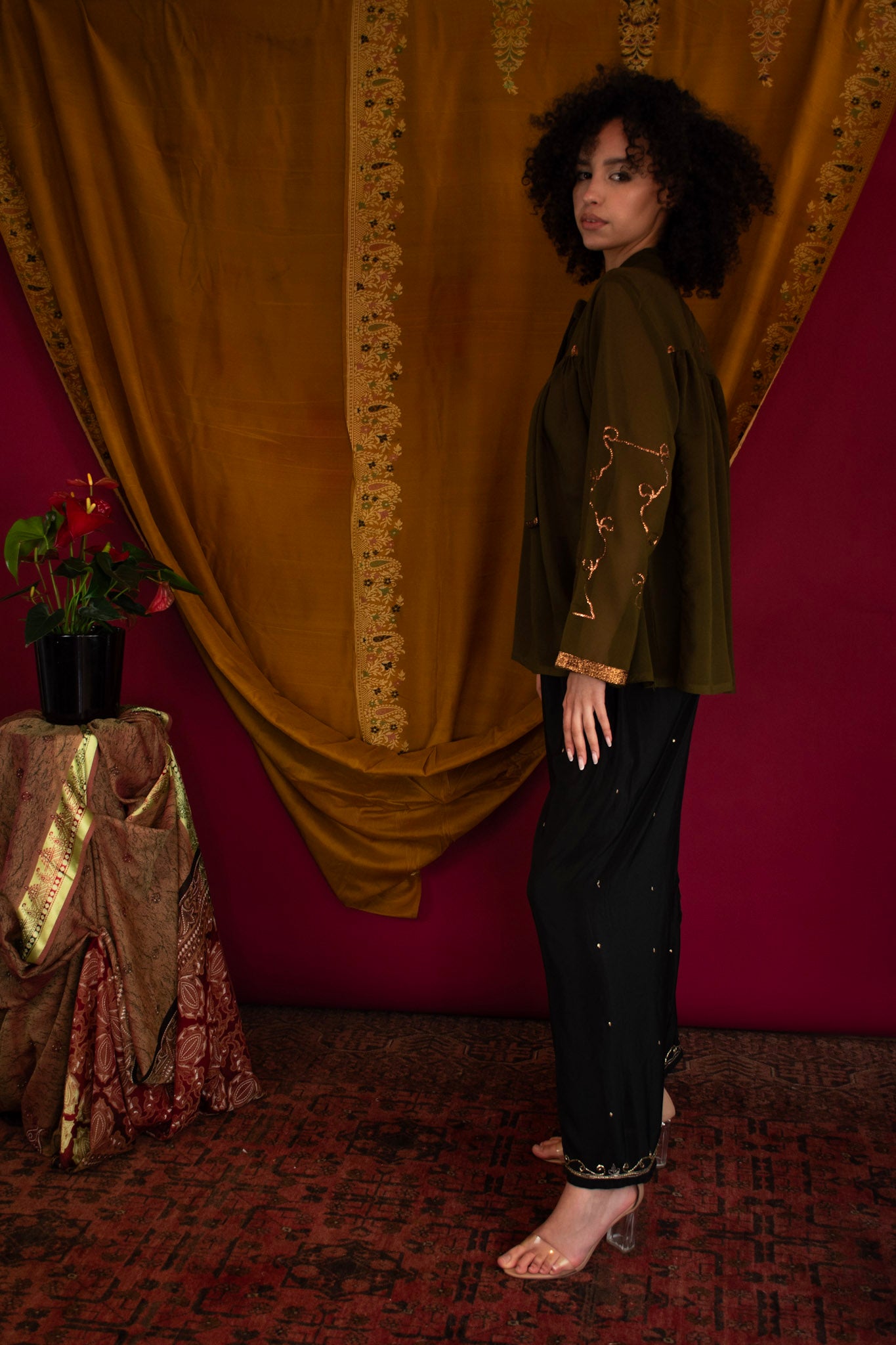Our Sufi Tops are crafted from chiffon saris donated by our Sari Donor community, each carrying a story of renewal. Designed to move with you, the bow-tied neckline adds a touch of elegance, while the billowing silhouette flows like poetry with every step.