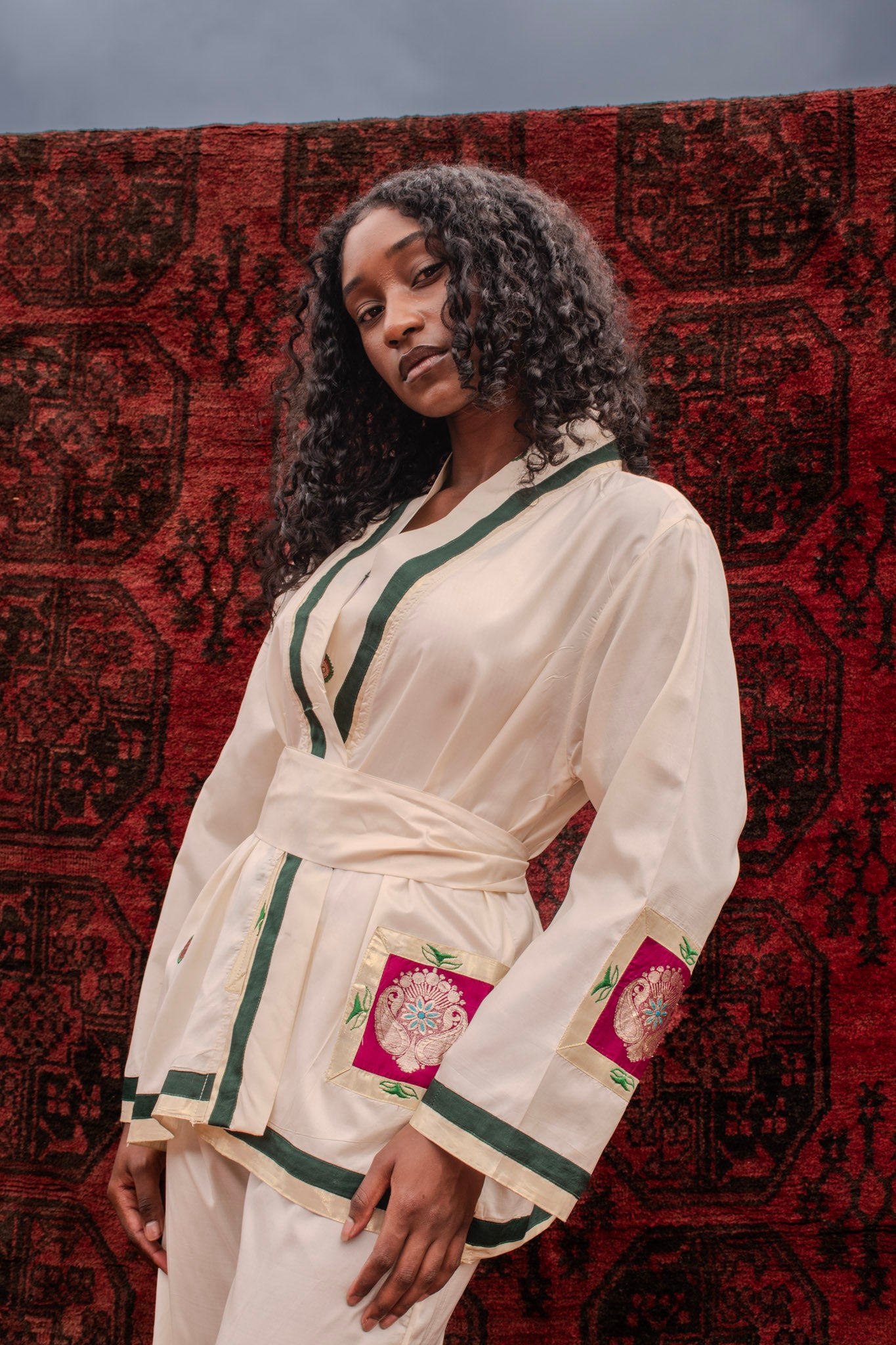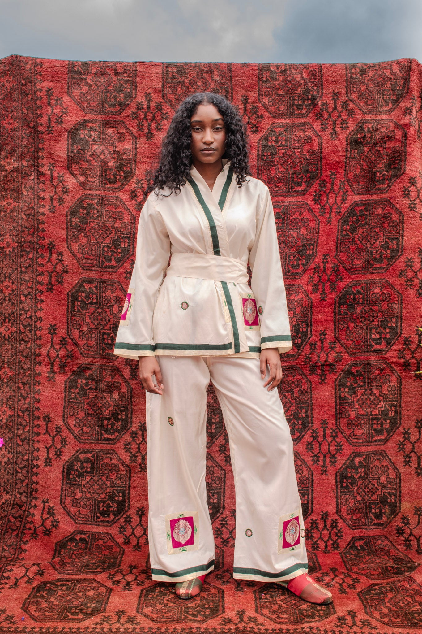 The set features a wrap-style jacket with a softly defined waist and relaxed sleeves, paired with fluid, elasticated pants designed for comfort and ease. Together, the silhouette feels calm and considered-elevated yet wearable, allowing the silk’s understated beauty to take centre stage.