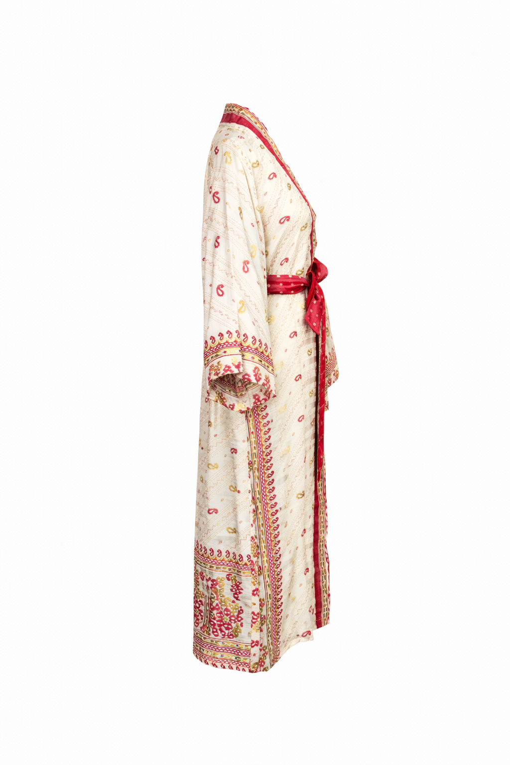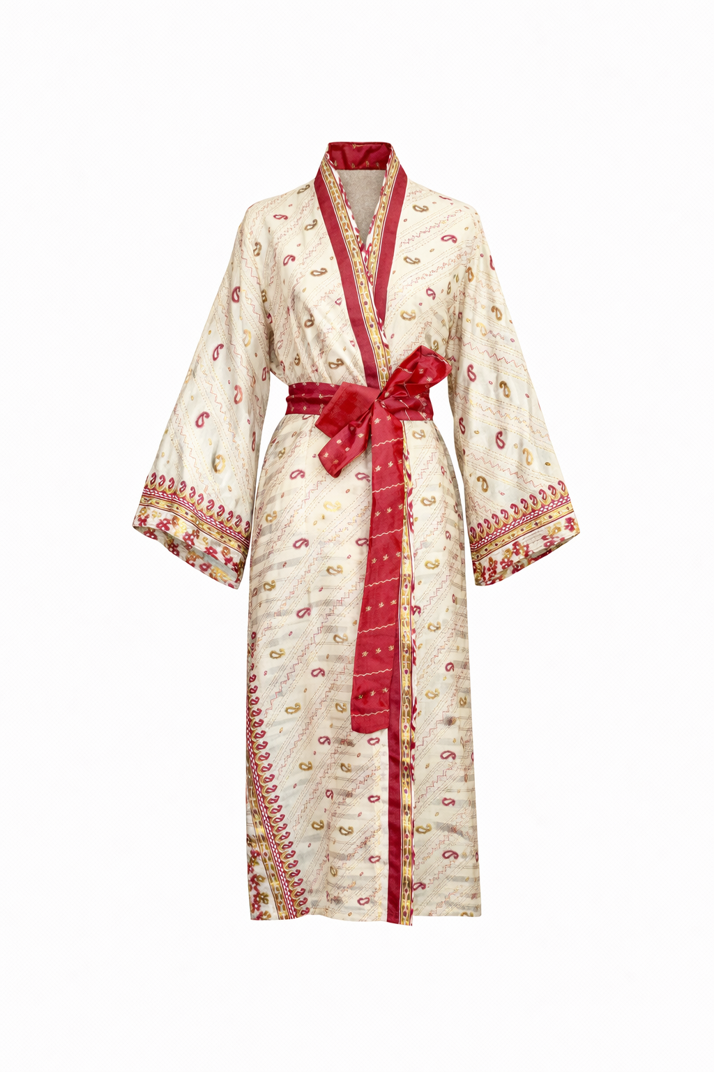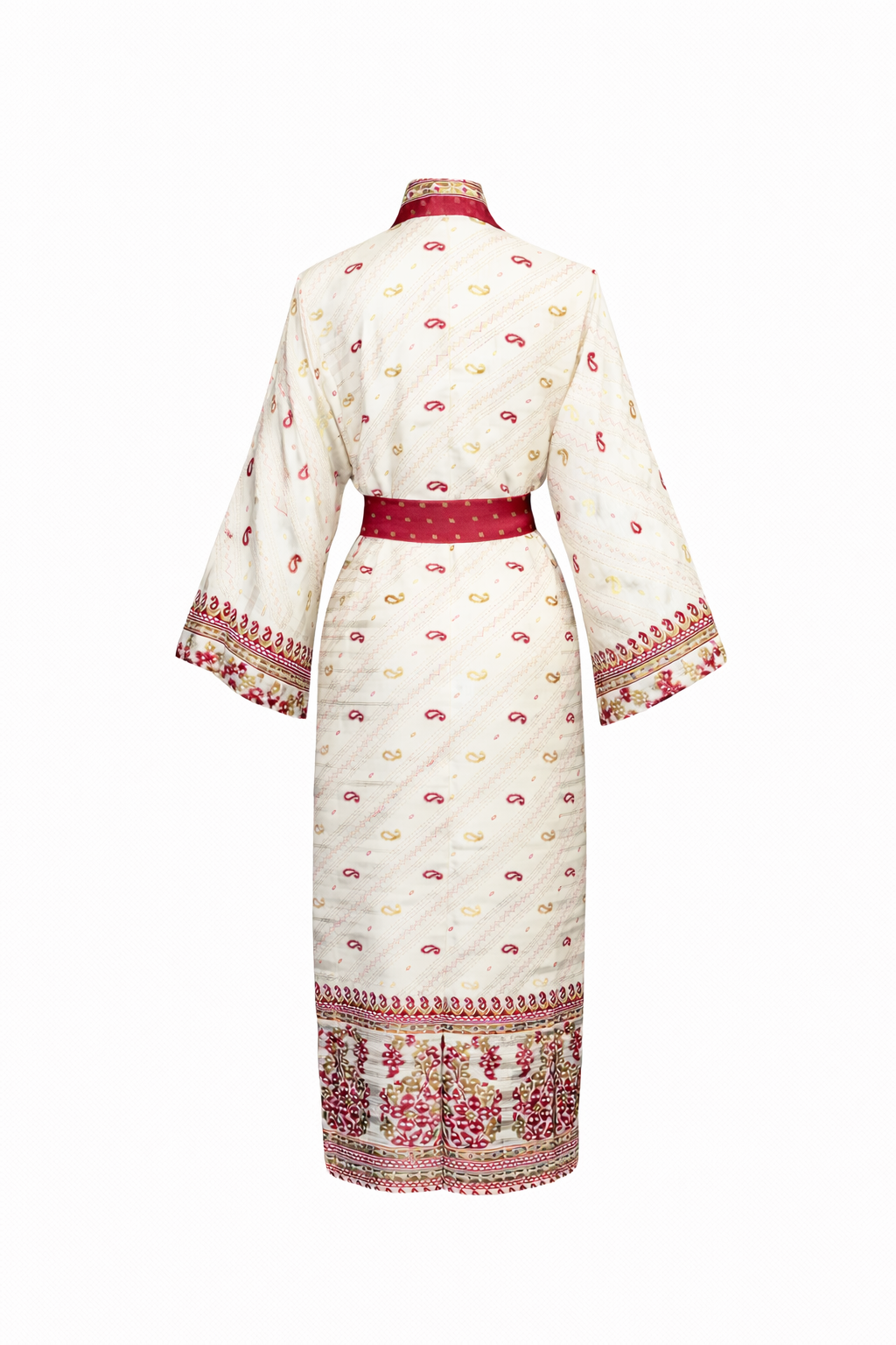 A warm ivory base is scattered with delicate paisley motifs, while deep red borders frame the piece with quiet confidence. Fine detailing along the trims and cuffs adds rhythm and heritage, giving the silk a story that feels both timeless and deeply personal.
