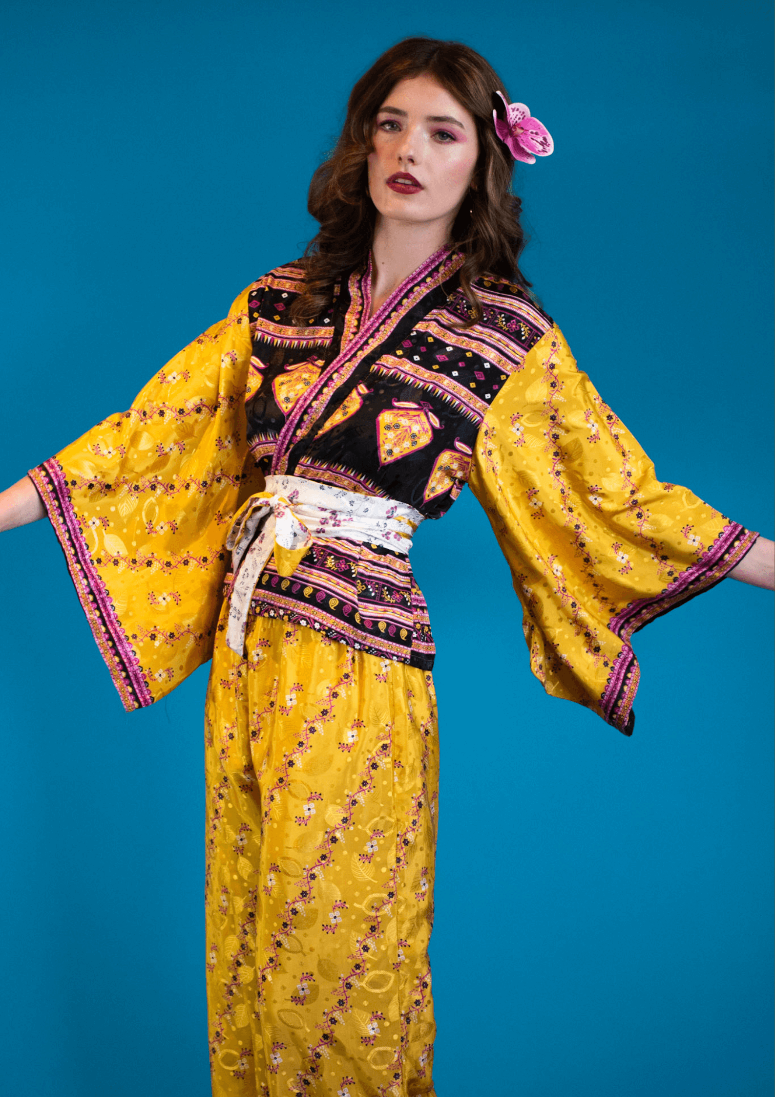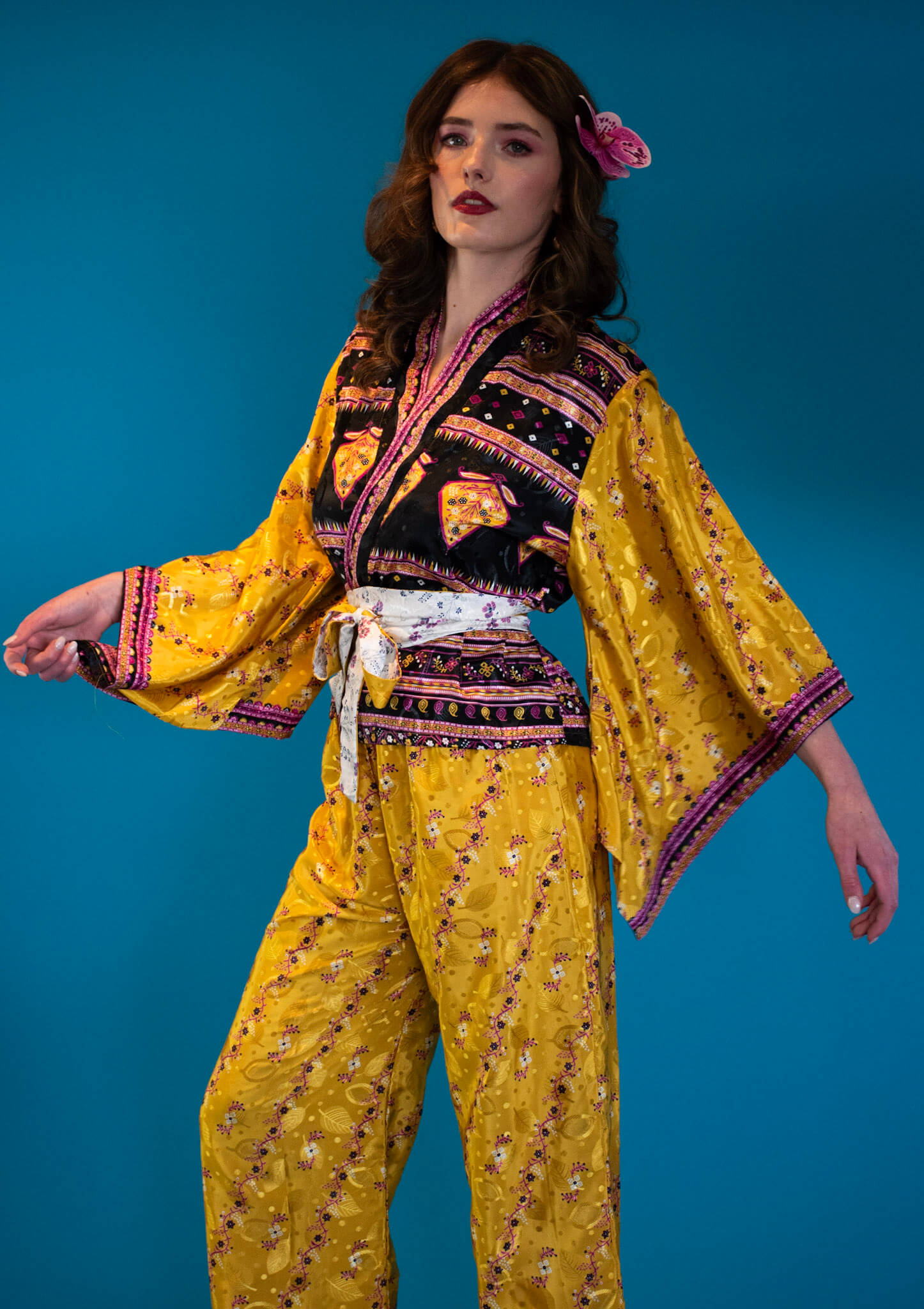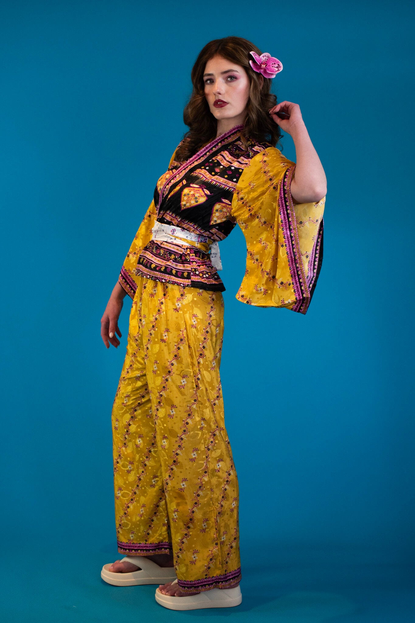 Inspired by the elegance of the Japanese kimono, this kimono jacket and pants set reimagines tradition through the artistry of Indian textiles. Each piece is crafted from carefully curated floral silk saris, selected for their fine, painterly motifs that echo the serene beauty of Japanese botanical art. The result is a refined conversation between cultures - where Indian floral expressiveness meets Japanese Art.