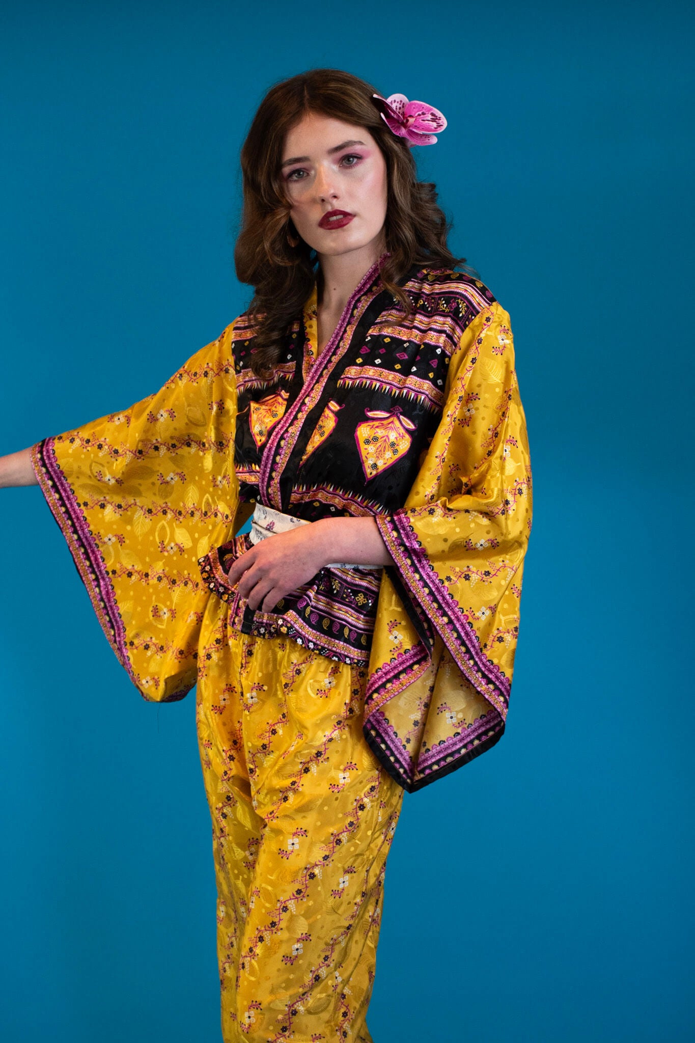 Fabric: Vibrant yellow silk brought to life with an explosion of paisley and floral detailing in shades of black and pink, creating a striking balance of warmth, contrast, and opulent artistry.
