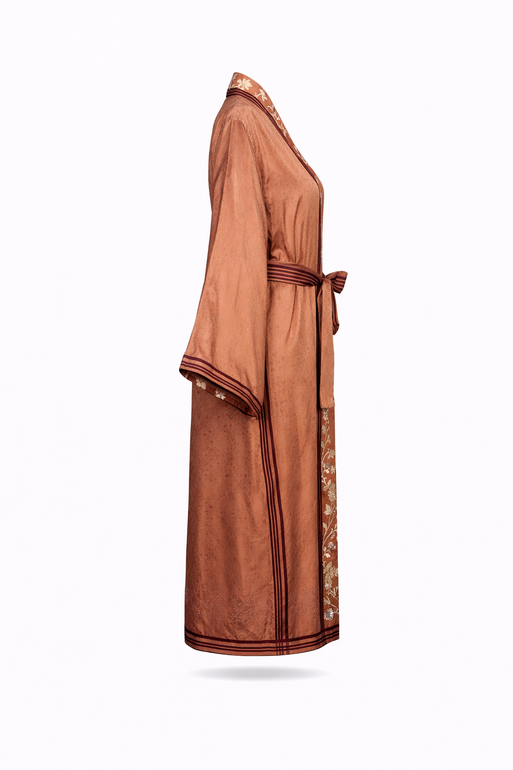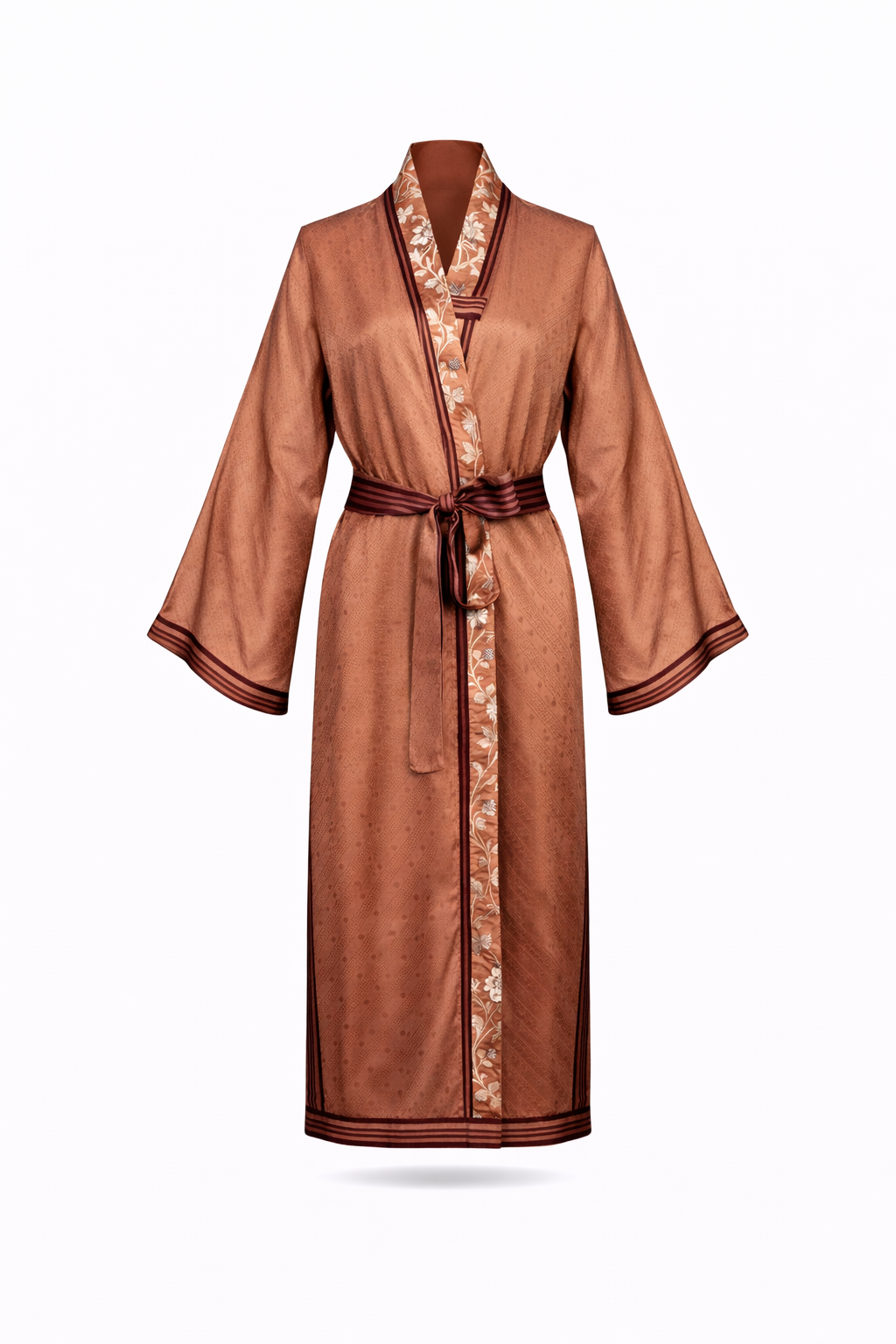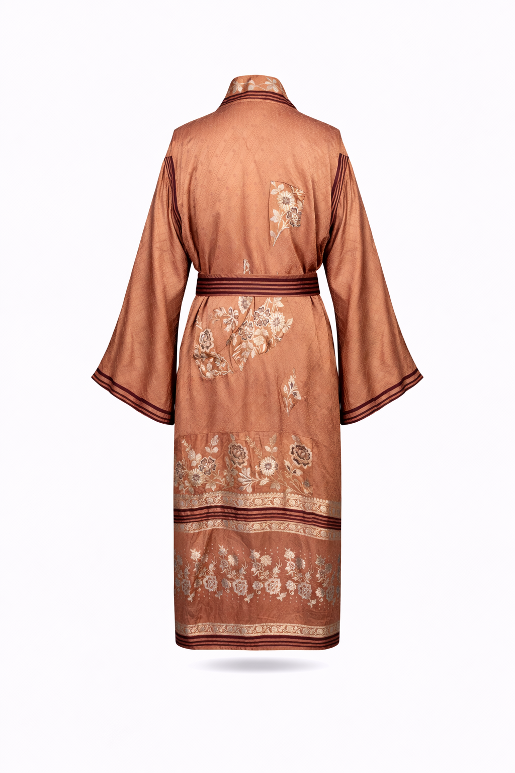 Crafted from softly woven silk, this kimono features warm copper and terracotta tones layered with delicate floral and vine motifs, inspired by traditional sari textiles. The fabric has a subtle sheen and fluid drape, offering a refined texture that feels both grounded and elegant.