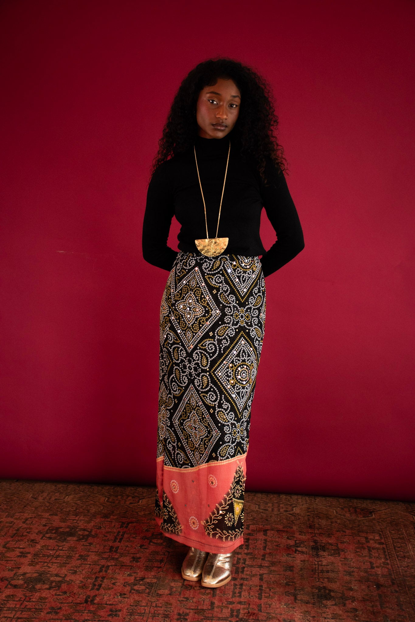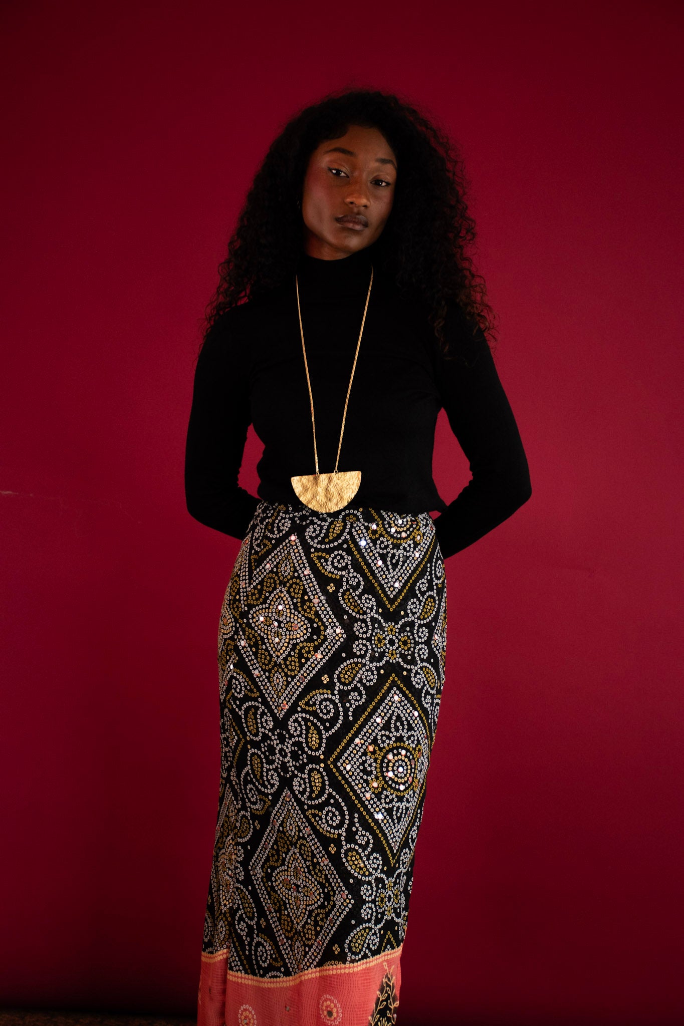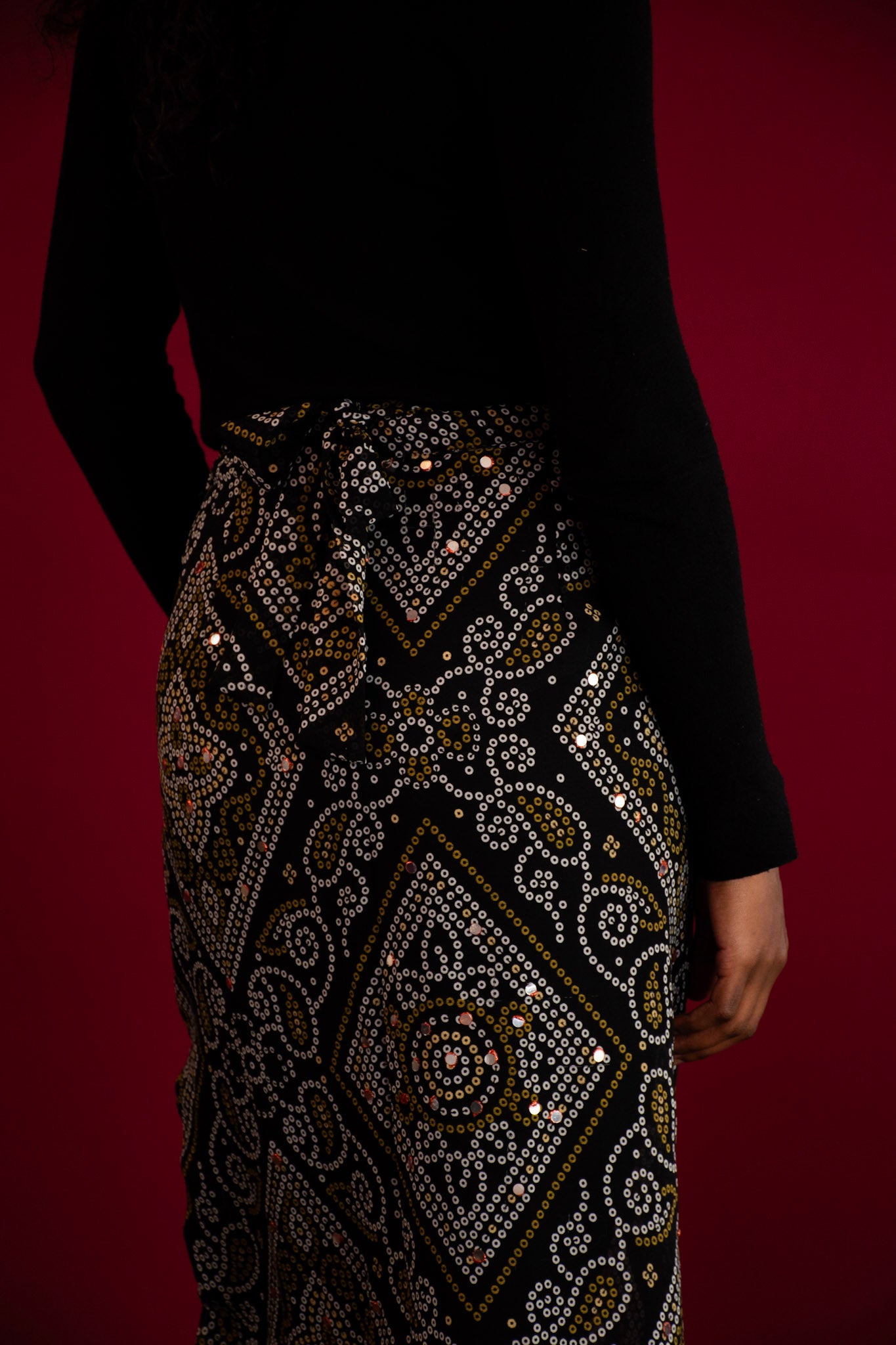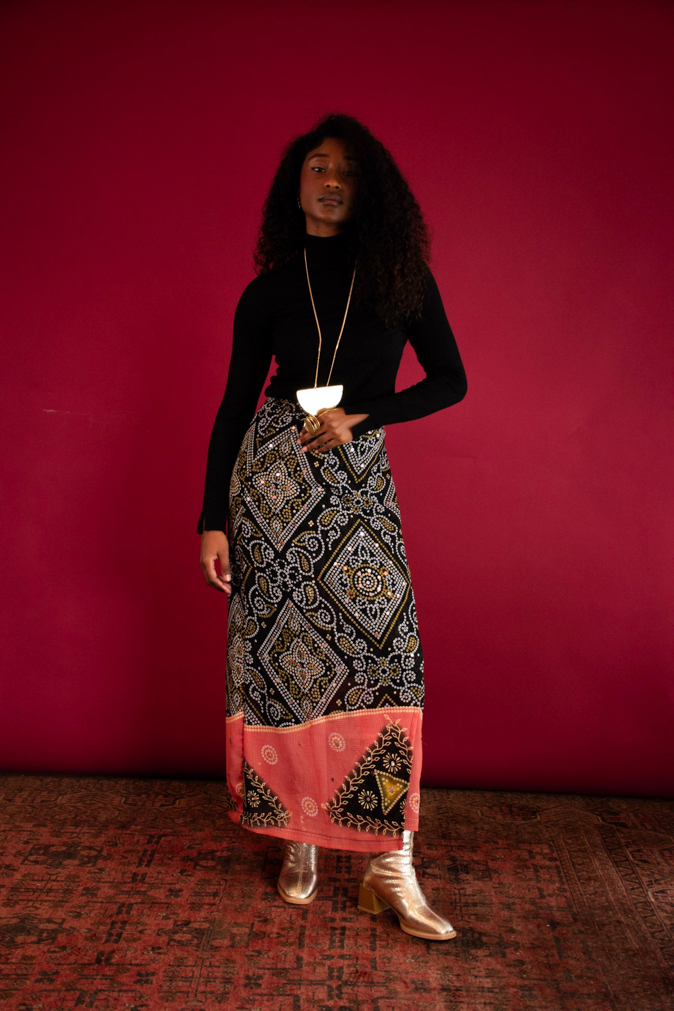 Made from lightweight black chiffon with a Bandhani-inspired print, it drapes easily, with darts at the waist for subtle shape. Effortless, airy, and rooted in cross-continental street style.
