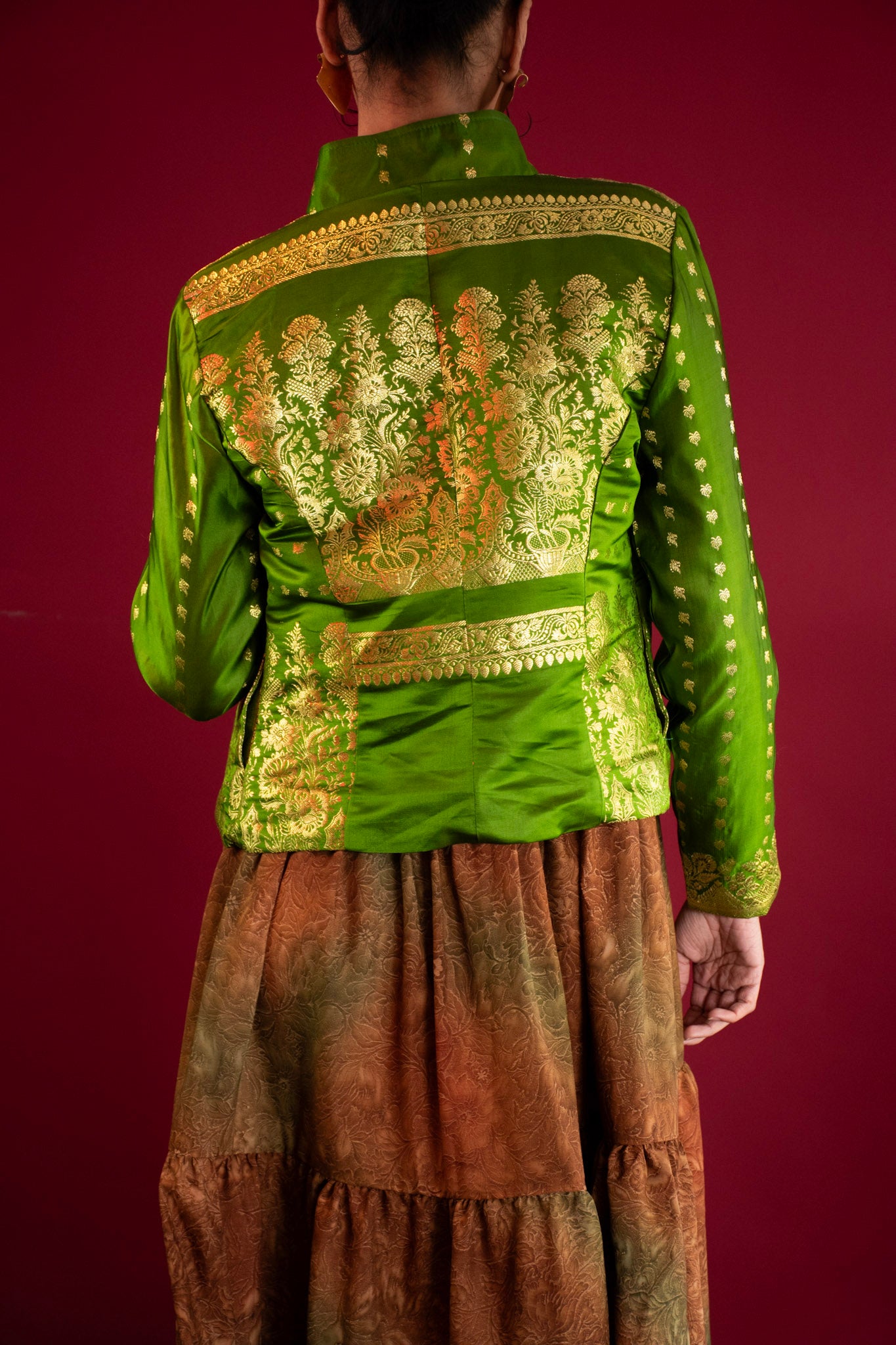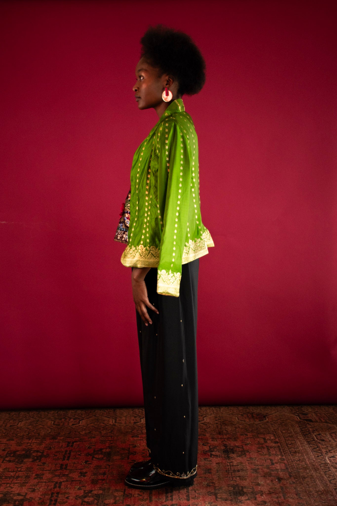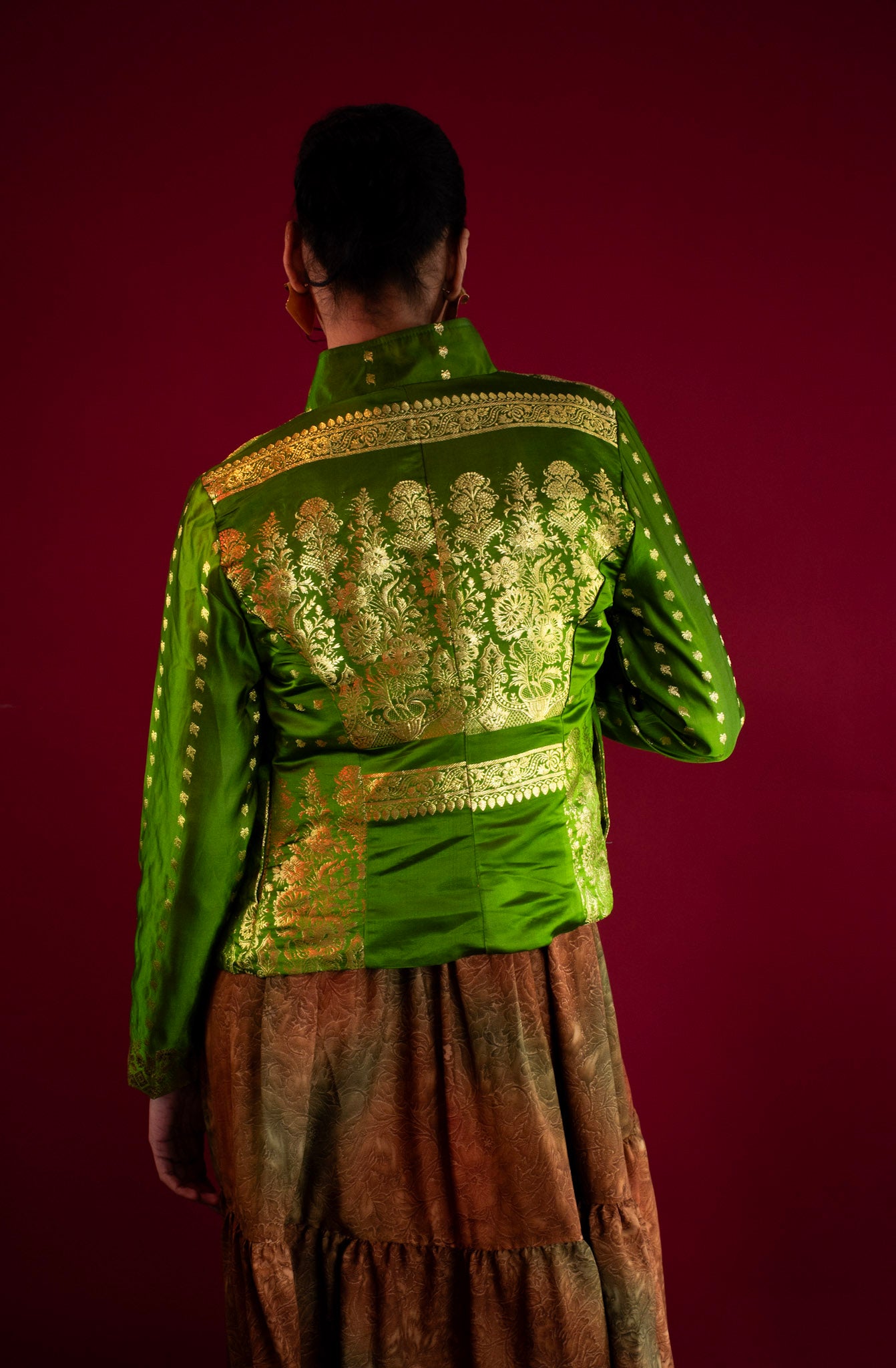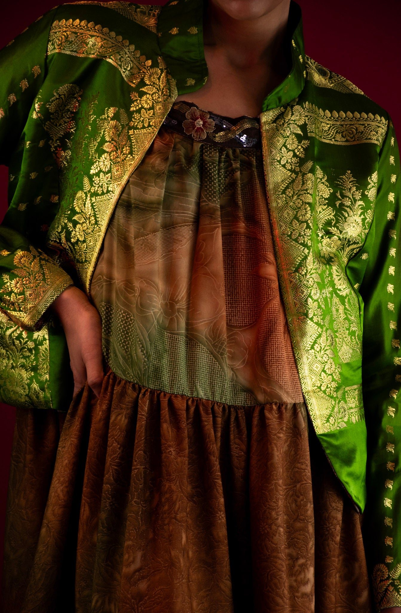 Crafted from rich green silk, the fabric features Banarasi weaving — a traditional North Indian technique known for its luxurious texture and intricate brocade patterns, originally created for royalty. The metallic threadwork is subtle yet regal, woven into silk like stories passed through generations.