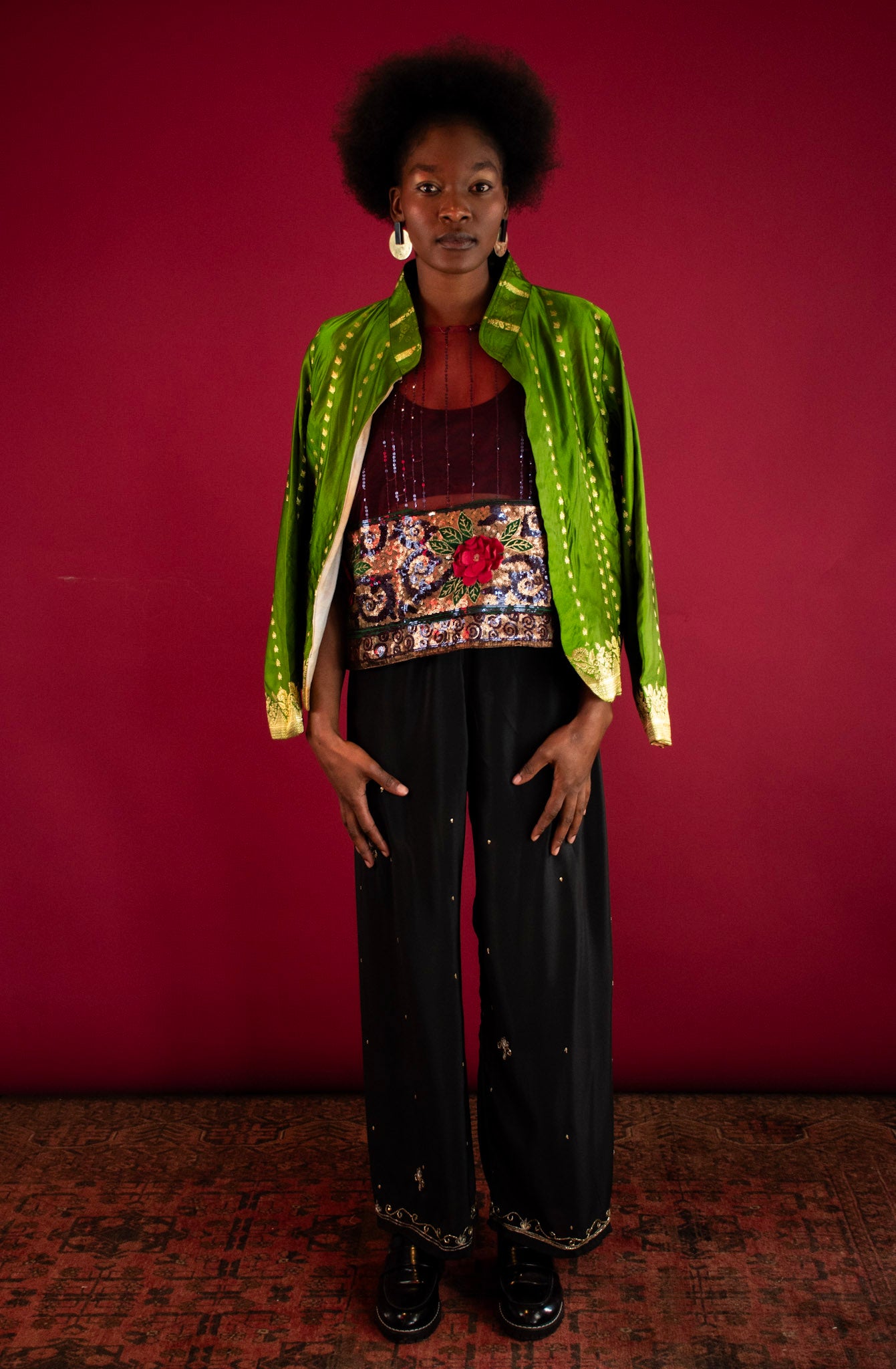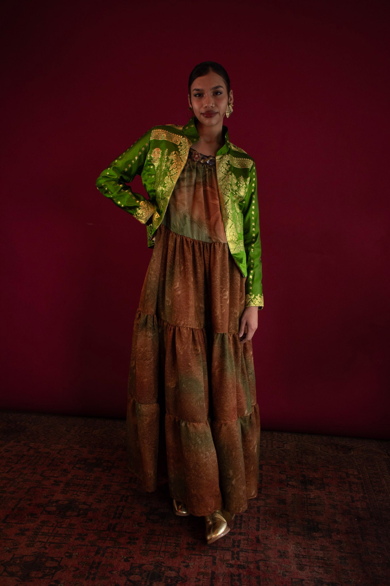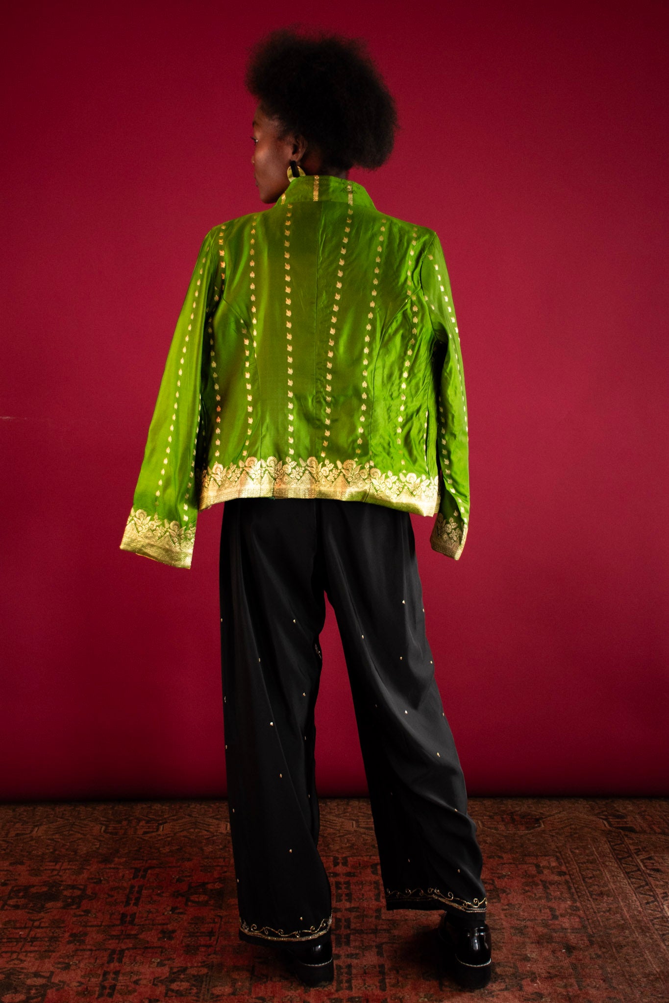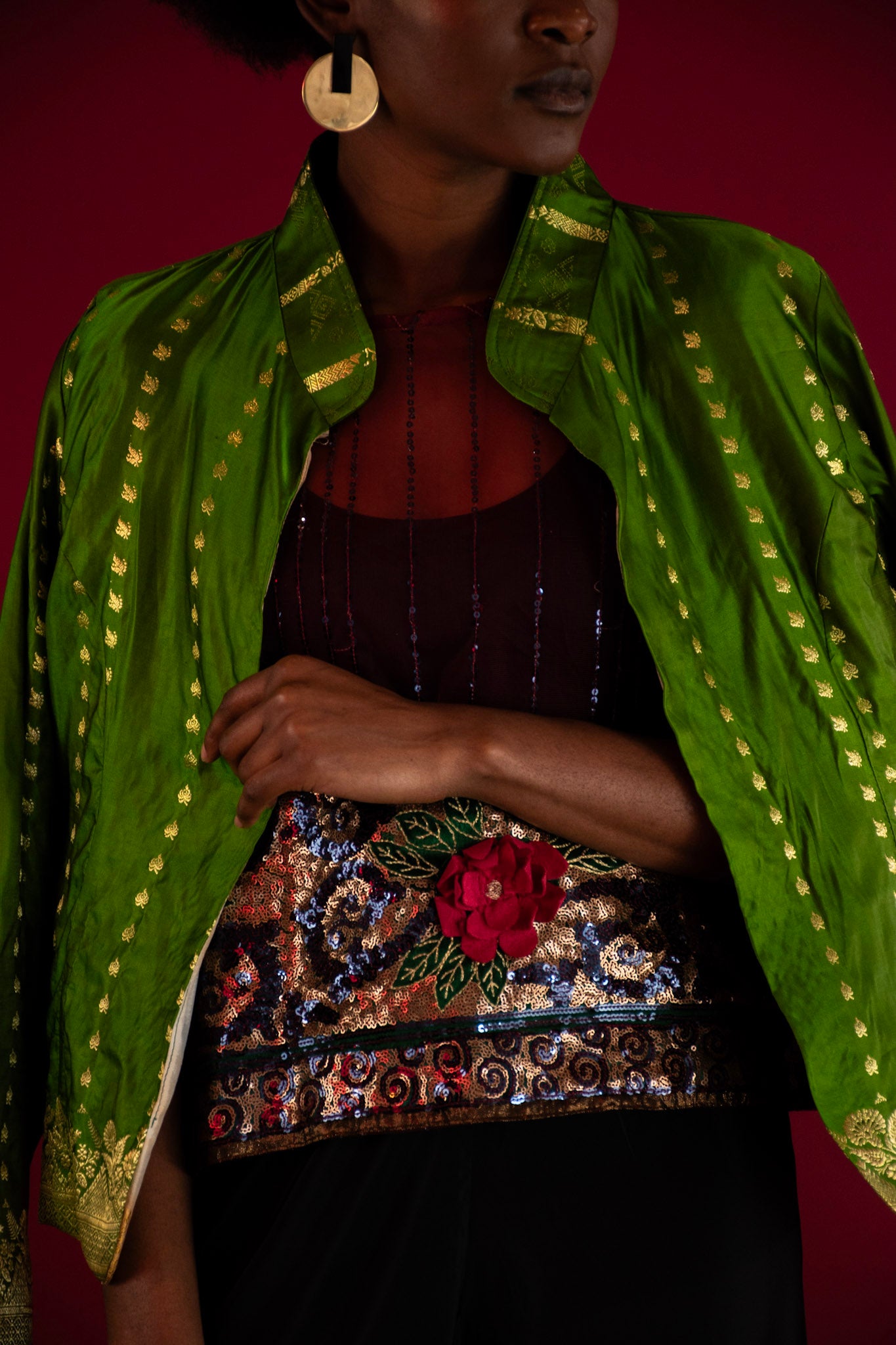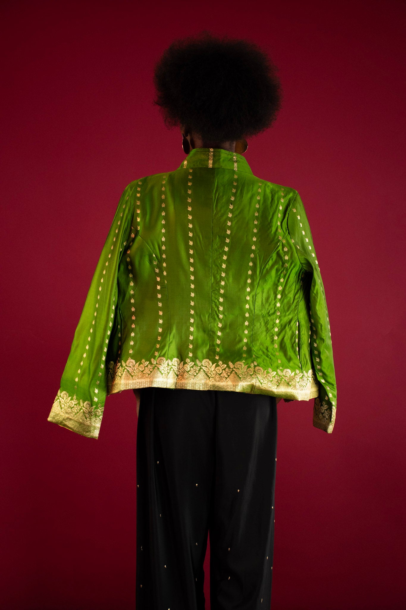 Crafted from rich green silk, the fabric features Banarasi weaving — a traditional North Indian technique known for its luxurious texture and intricate brocade patterns, originally created for royalty. The metallic threadwork is subtle yet regal, woven into silk like stories passed through generations.