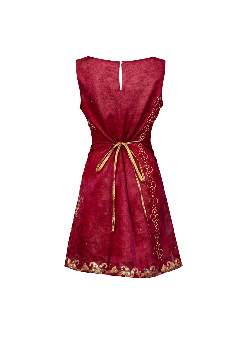 Crafted from upcycled organza saris, this Sari Shift Dress is adorned with delicate floral beading and subtle gold embroidery, echoing the fine lines of a map that trace movement and memory. Light and translucent, the fabric drapes softly over the body, allowing the intricate detailing to catch the light with every step.