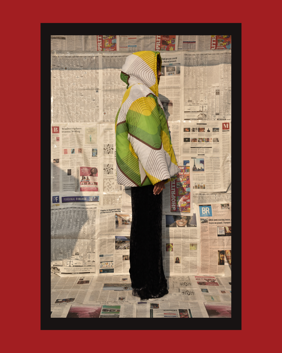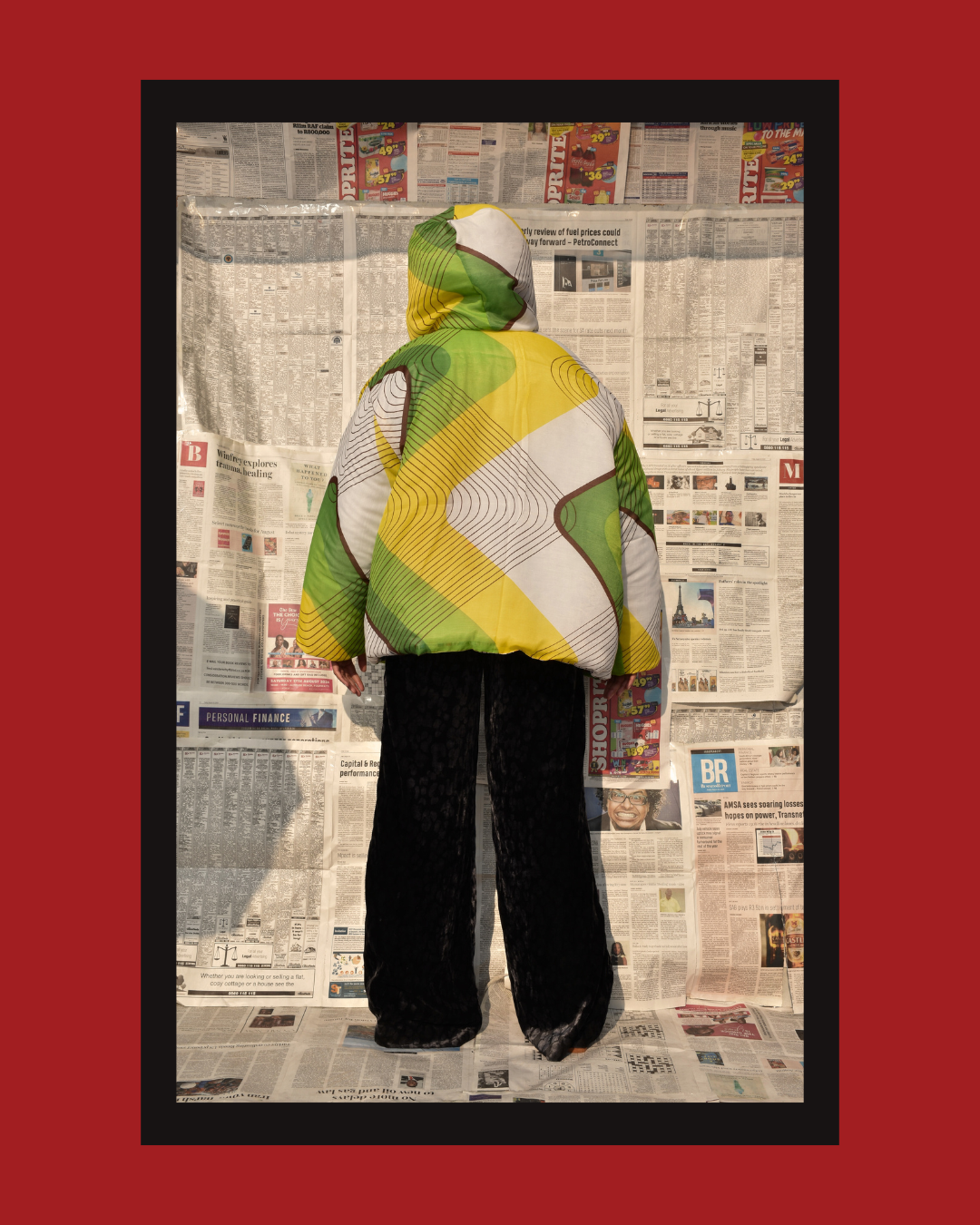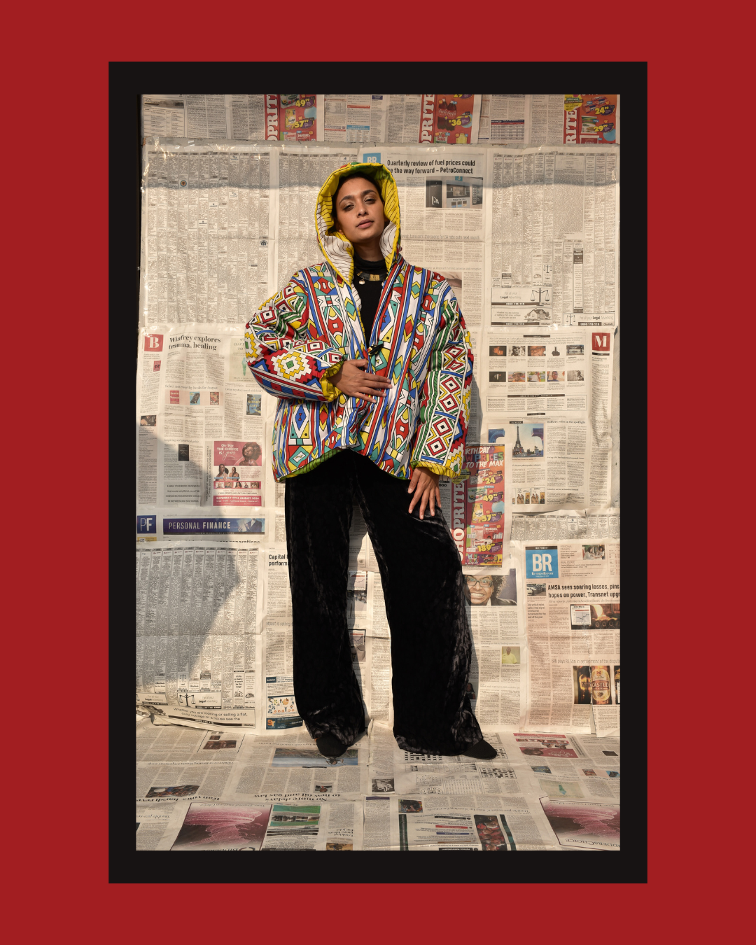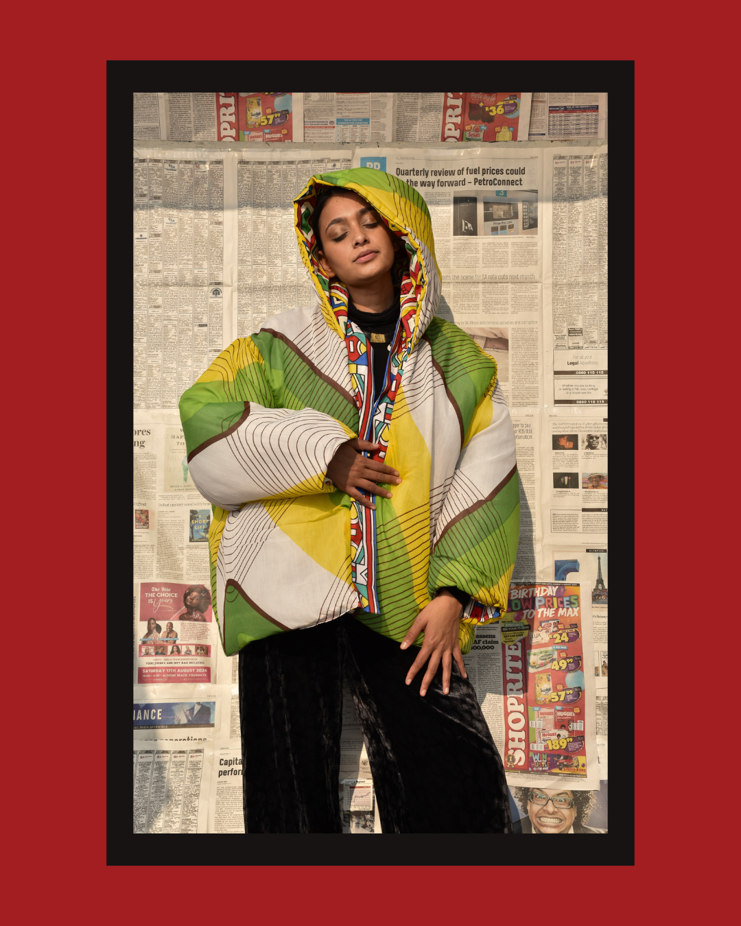 The Imanii Puffer, designed by Iman Ganijee, celebrates cultural fusion and unity made from the khanga and the reverse a sari. The khanga known for its African proverbs, political statements and symbols of unity.