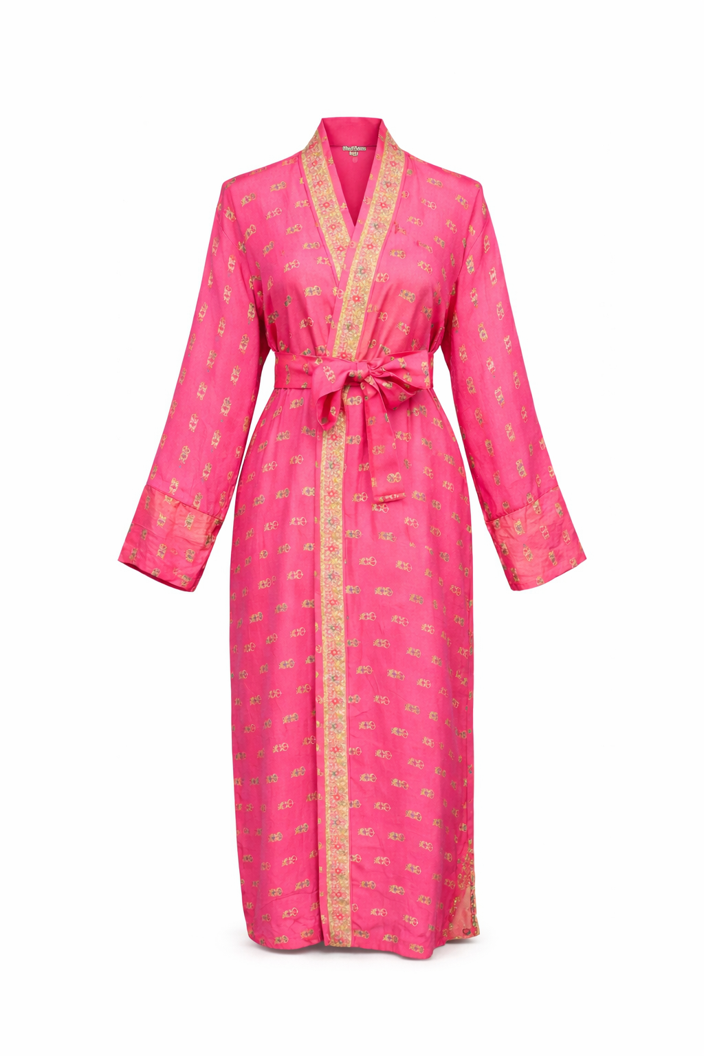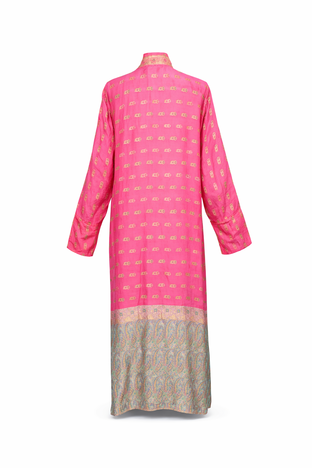 Crafted from richly textured Banarasi silk sari, this kimono carries a sense of ceremony and strength. The fabric is thicker and more structured than traditional silk, giving it a sculptural, outerwear feel while still allowing fluid movement. A vivid rose-pink base is illuminated with gold embroidery, woven into the silk itself so it shimmers softly as it catches the light.